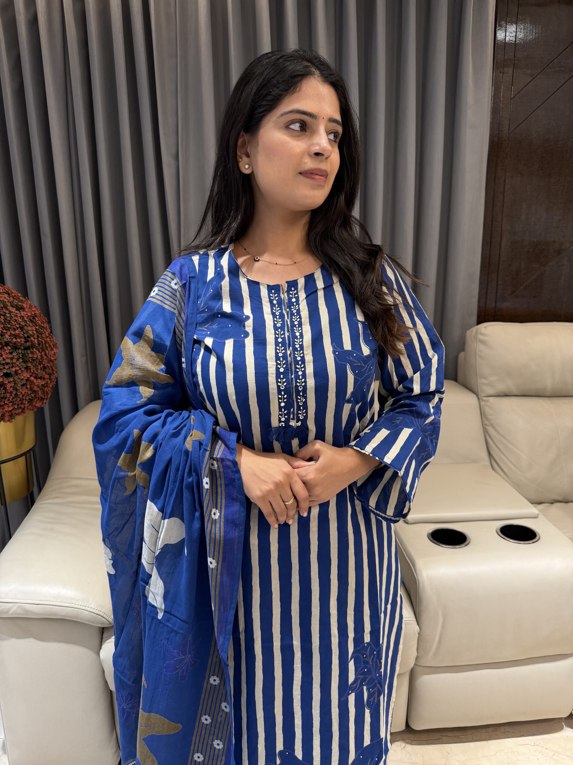 * Print: The stunning dupatta contrasts the kurta’s stripes with a rich blue base showcasing large, artistic white and gold floral motifs (like lilies).