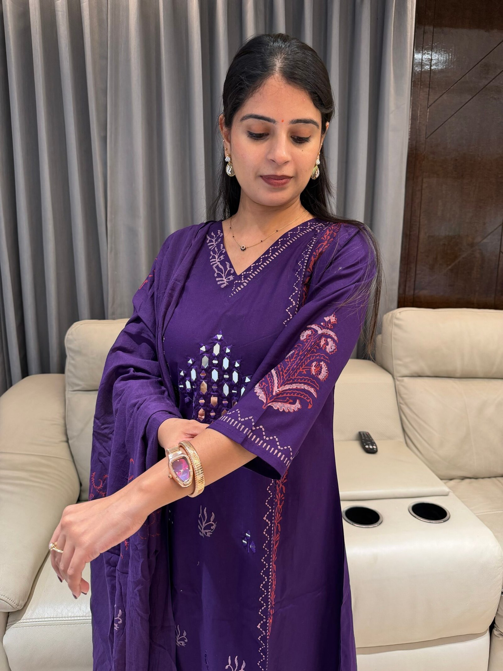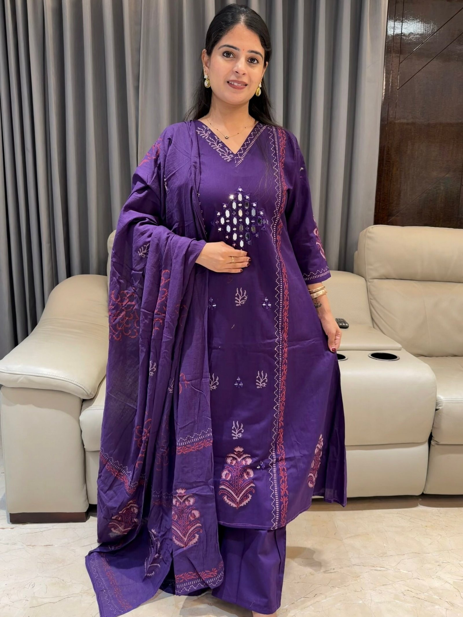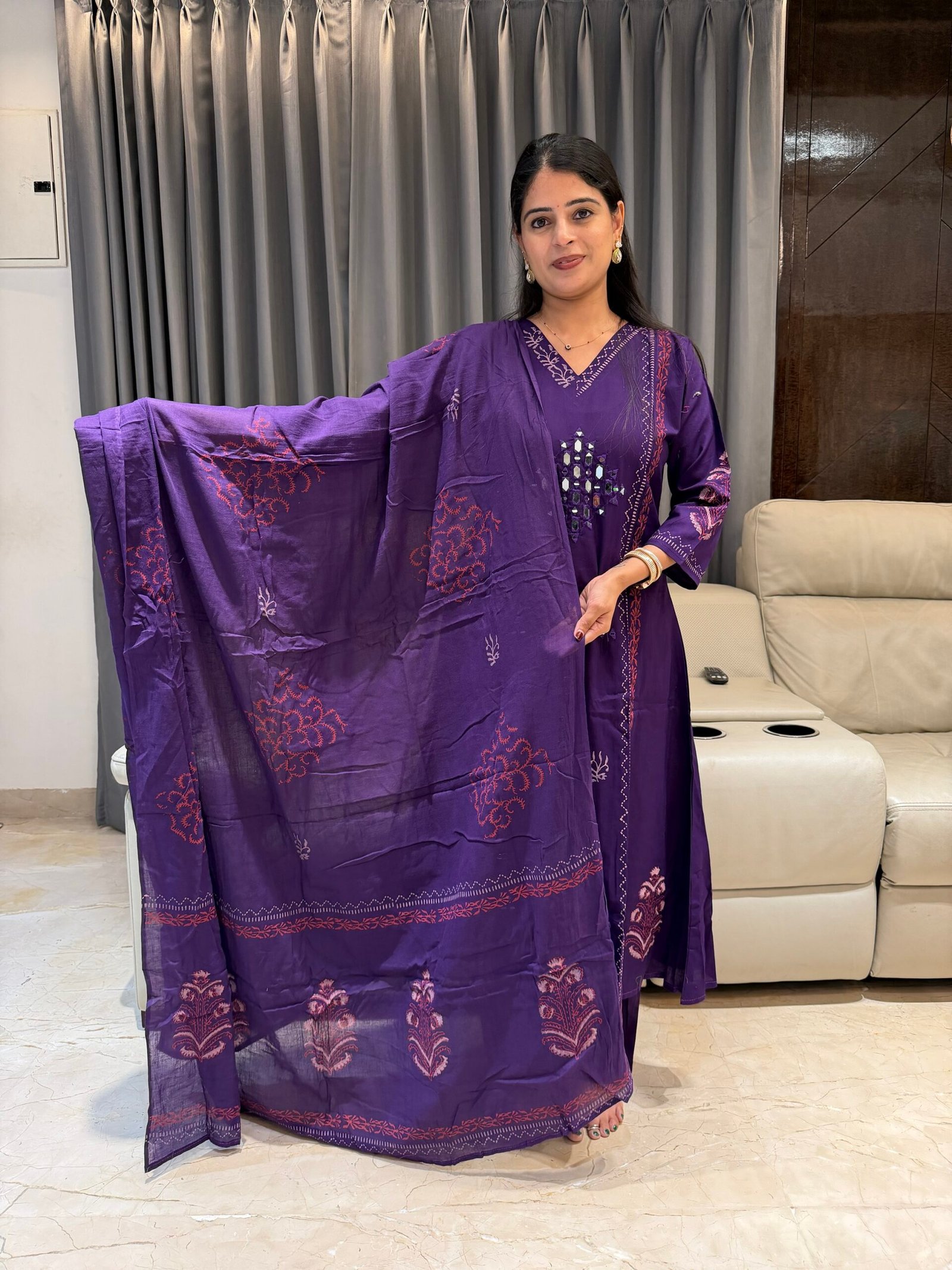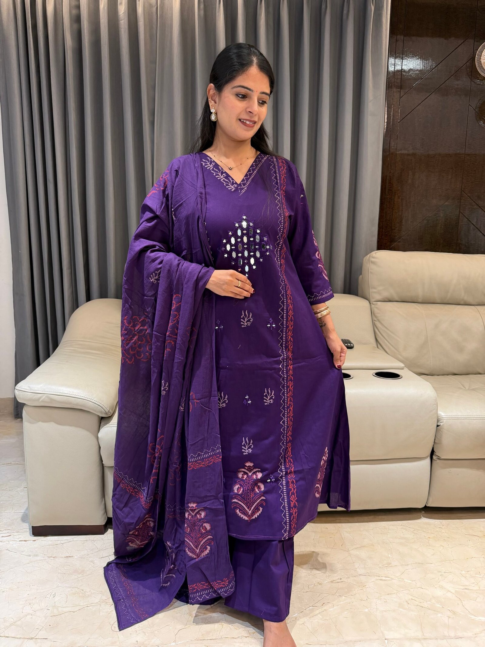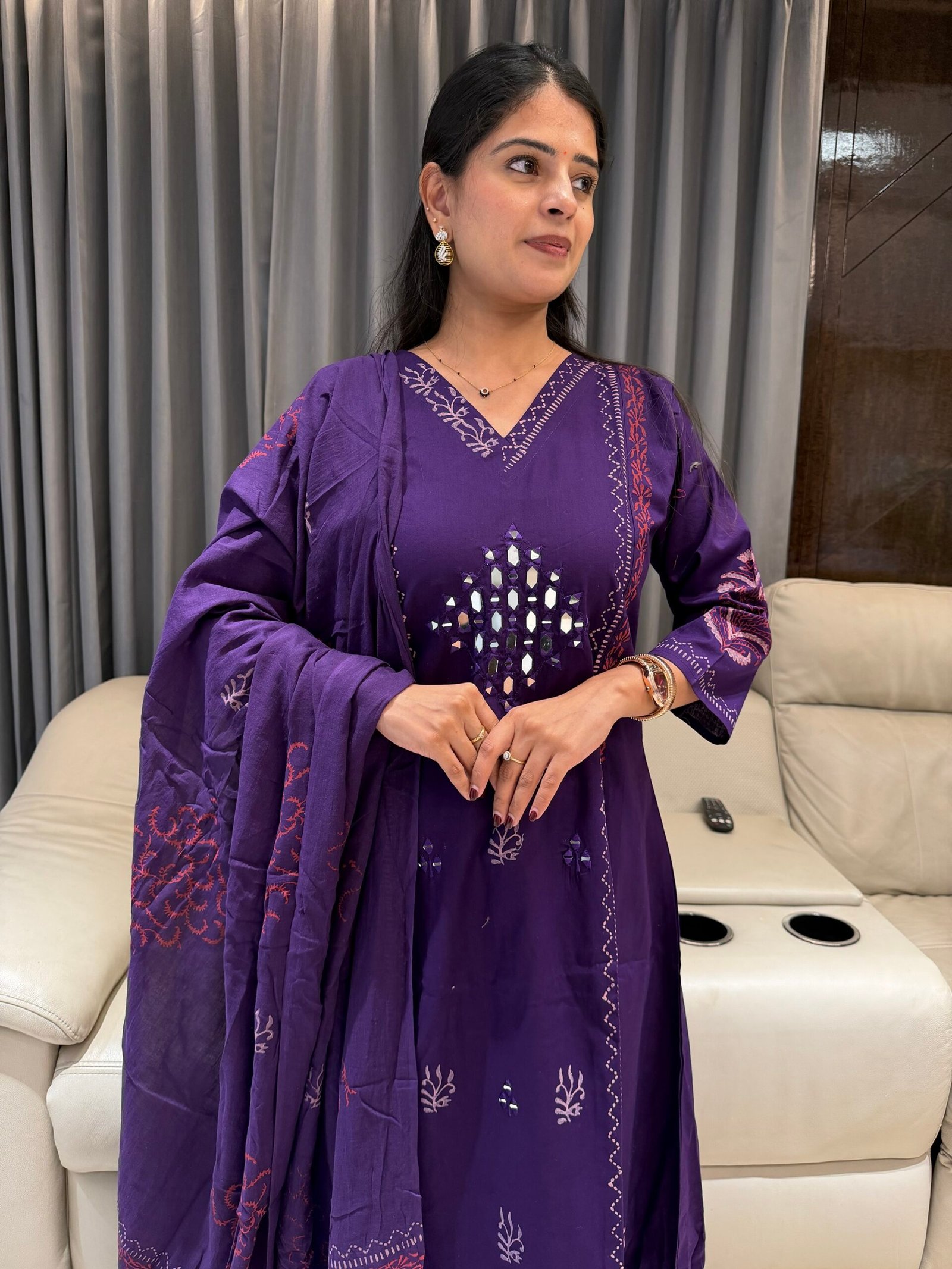 Step into timeless grace with this pure cotton kurta set featuring intricate real mirror work and beautiful hand painting details 💜