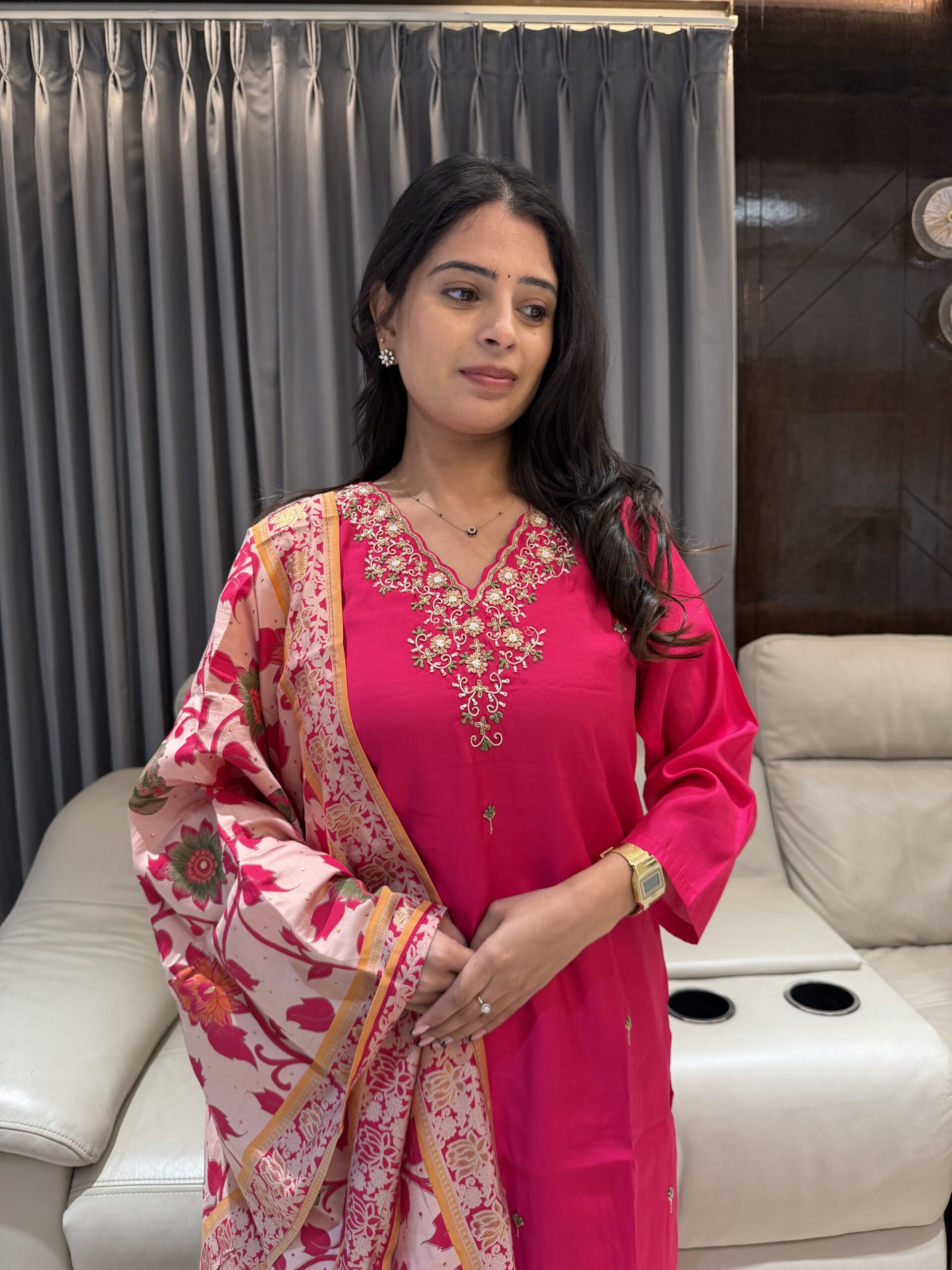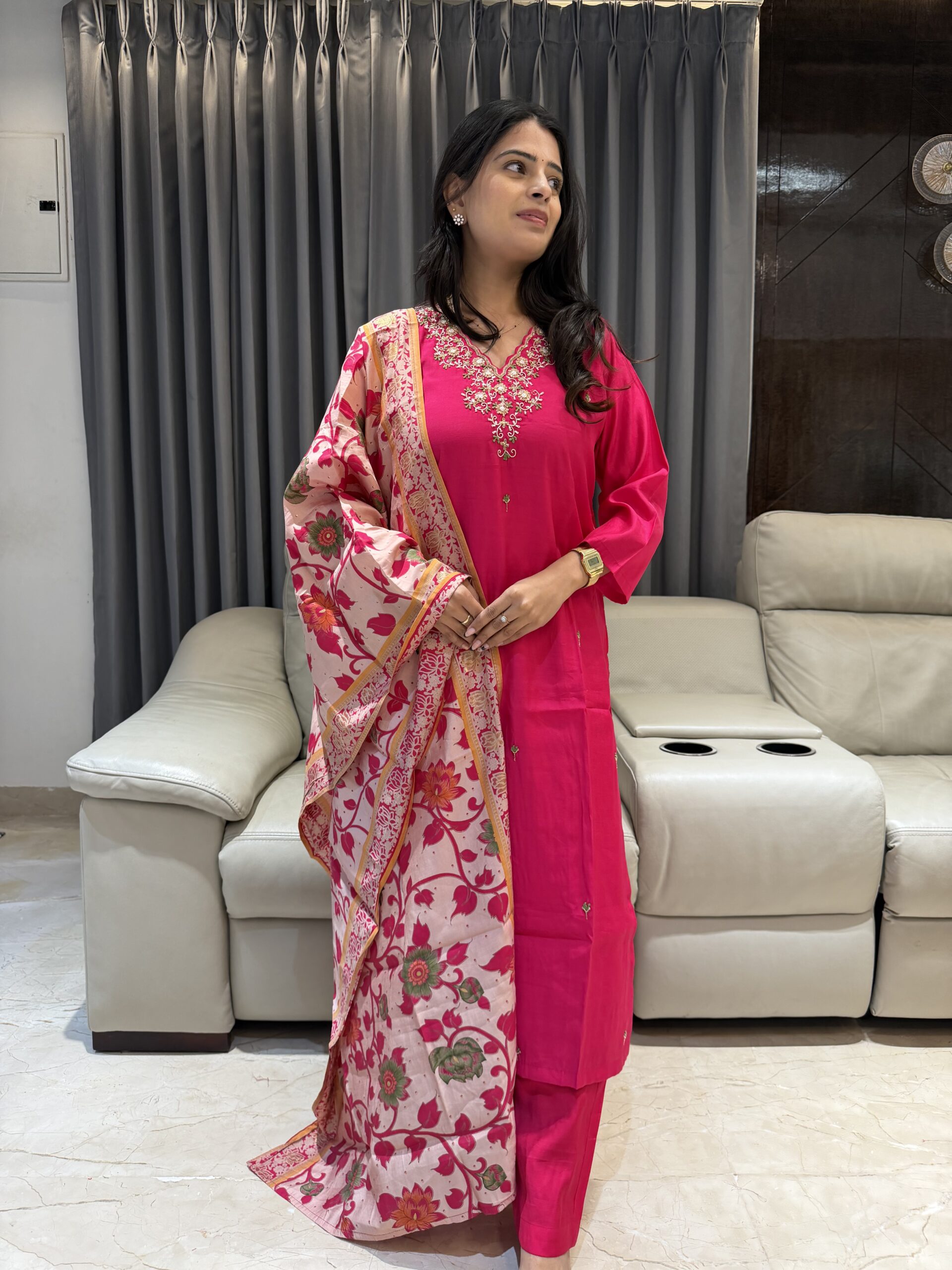 Our premium party wear kurta set featuring an elegant Kalamkari print dupatta and exquisite zardosi work on the neckline is designed to make you stand out effortlessly. A perfect blend of tradition and elegance, making it an ideal party wear ethnic outfit for festive evenings, weddings, and special occasions. ✨