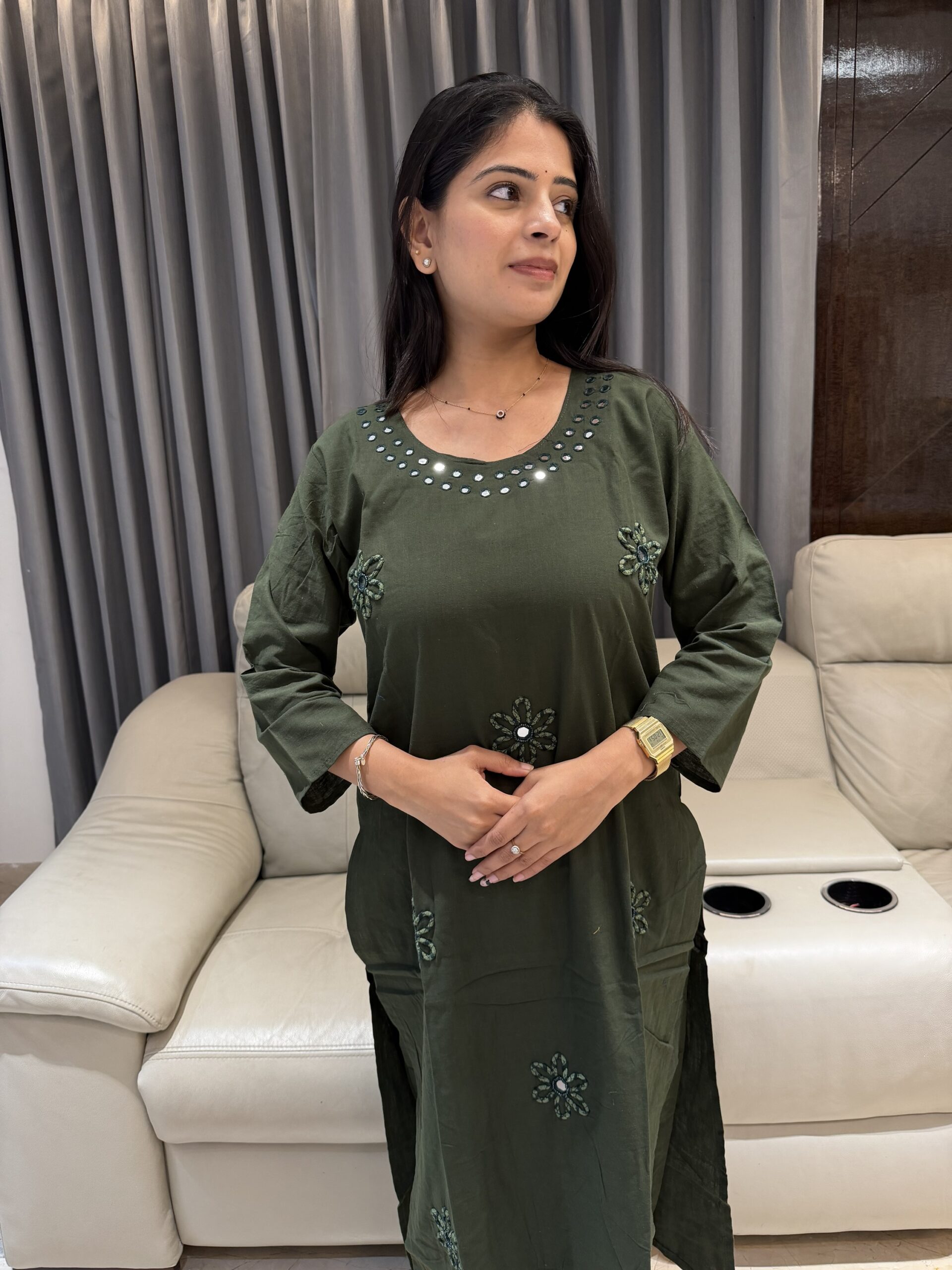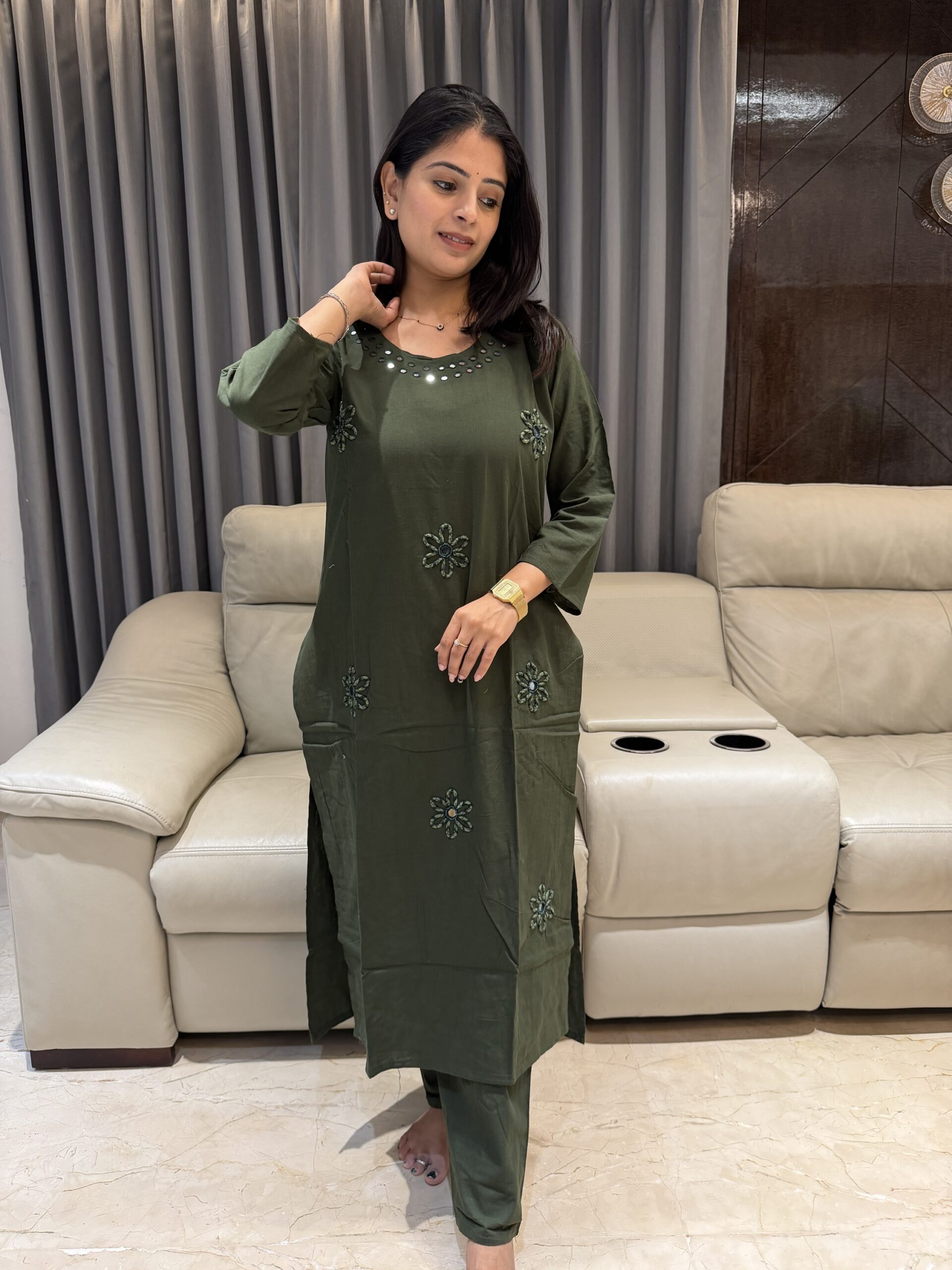 This stunning olive green kurta–pant set is designed for comfort with a touch of festive charm. Crafted in a soft, breathable fabric, the kurta features a beautifully detailed round neckline adorned with subtle mirror accents that add just the right hint of shimmer.