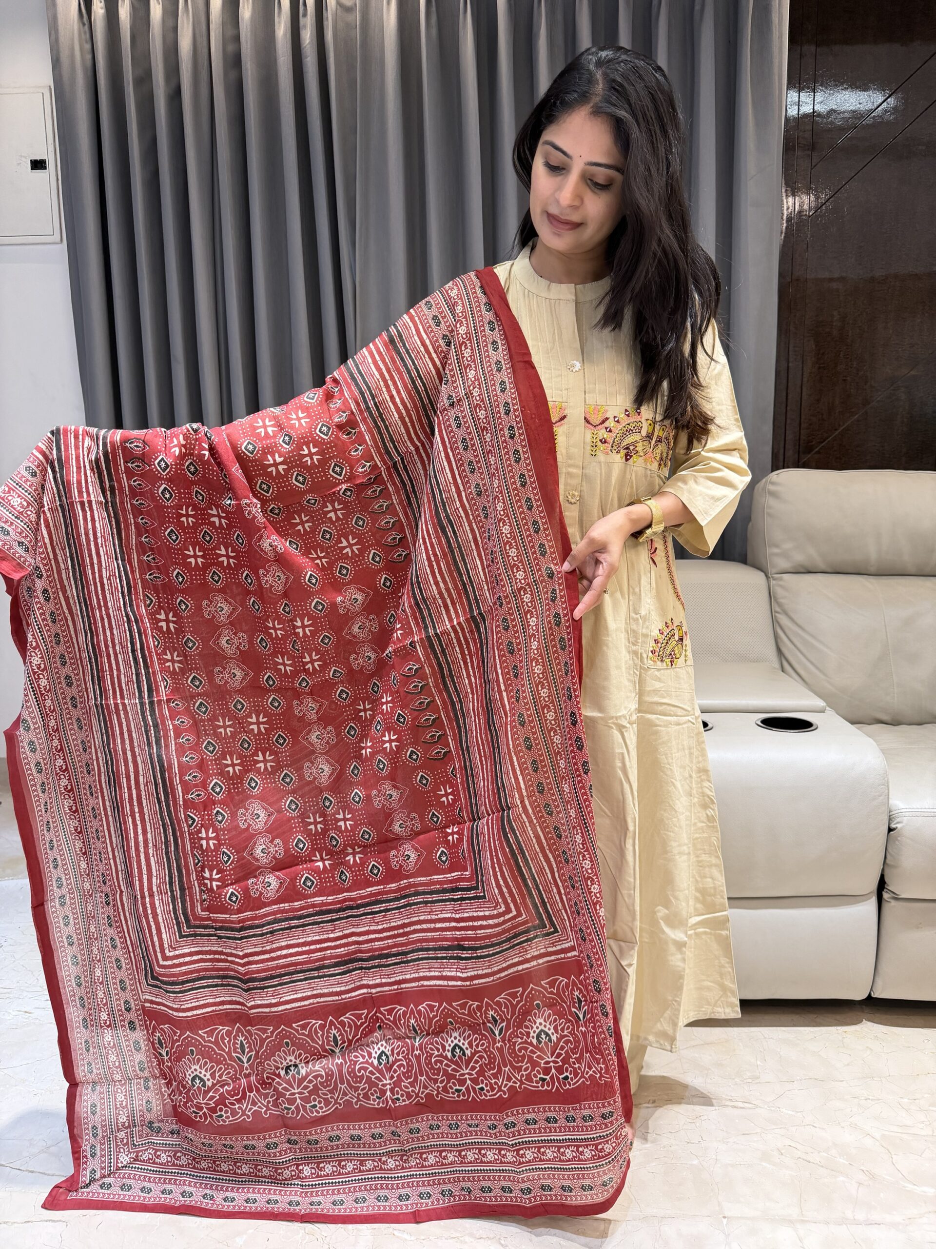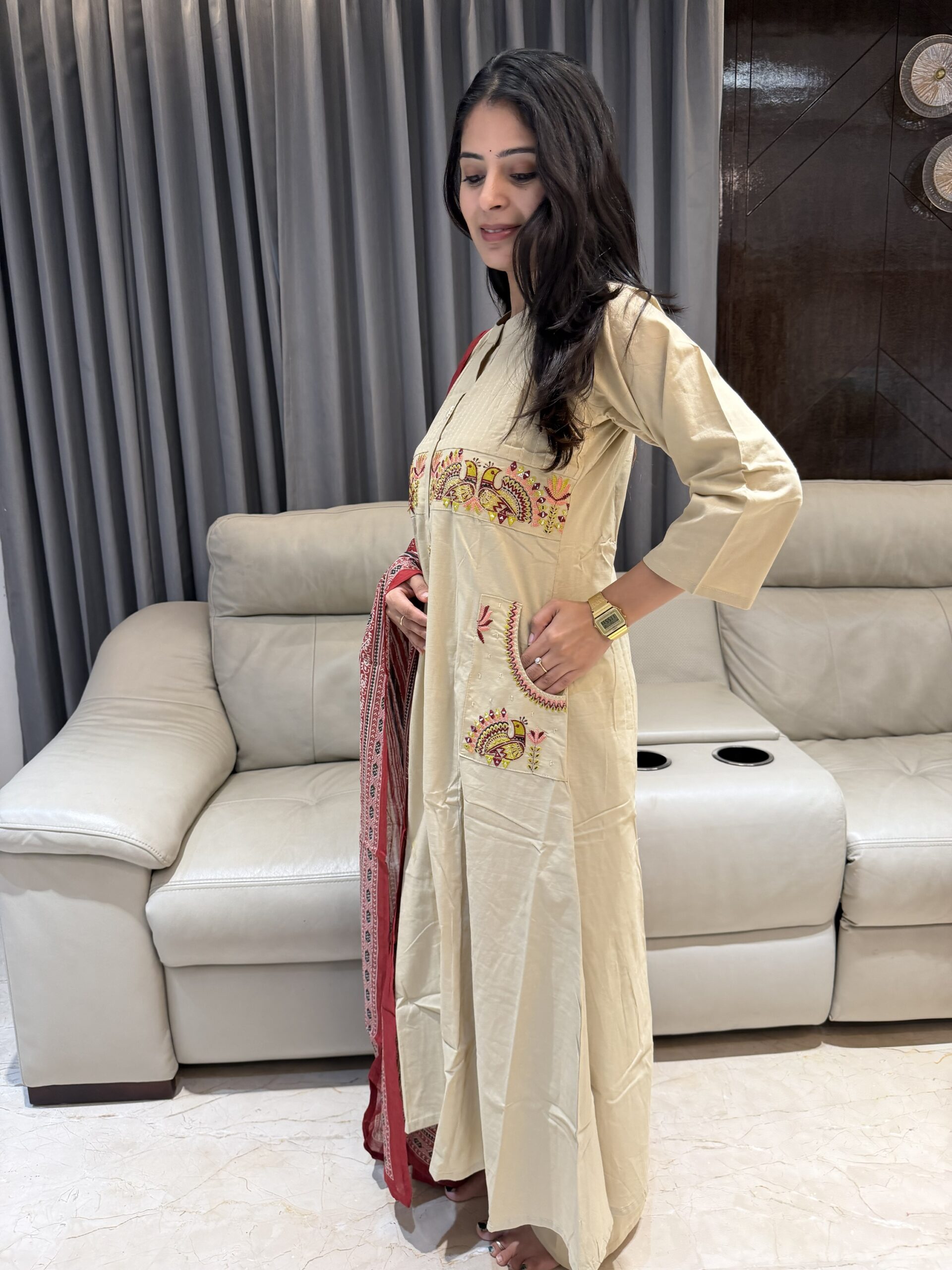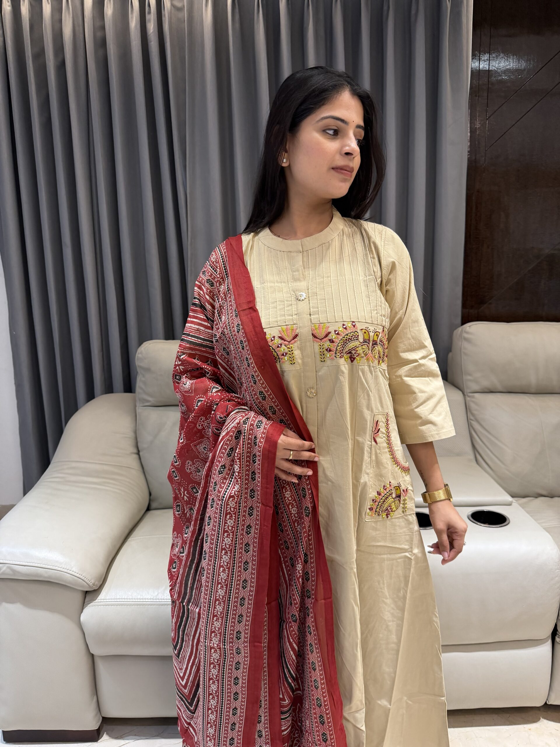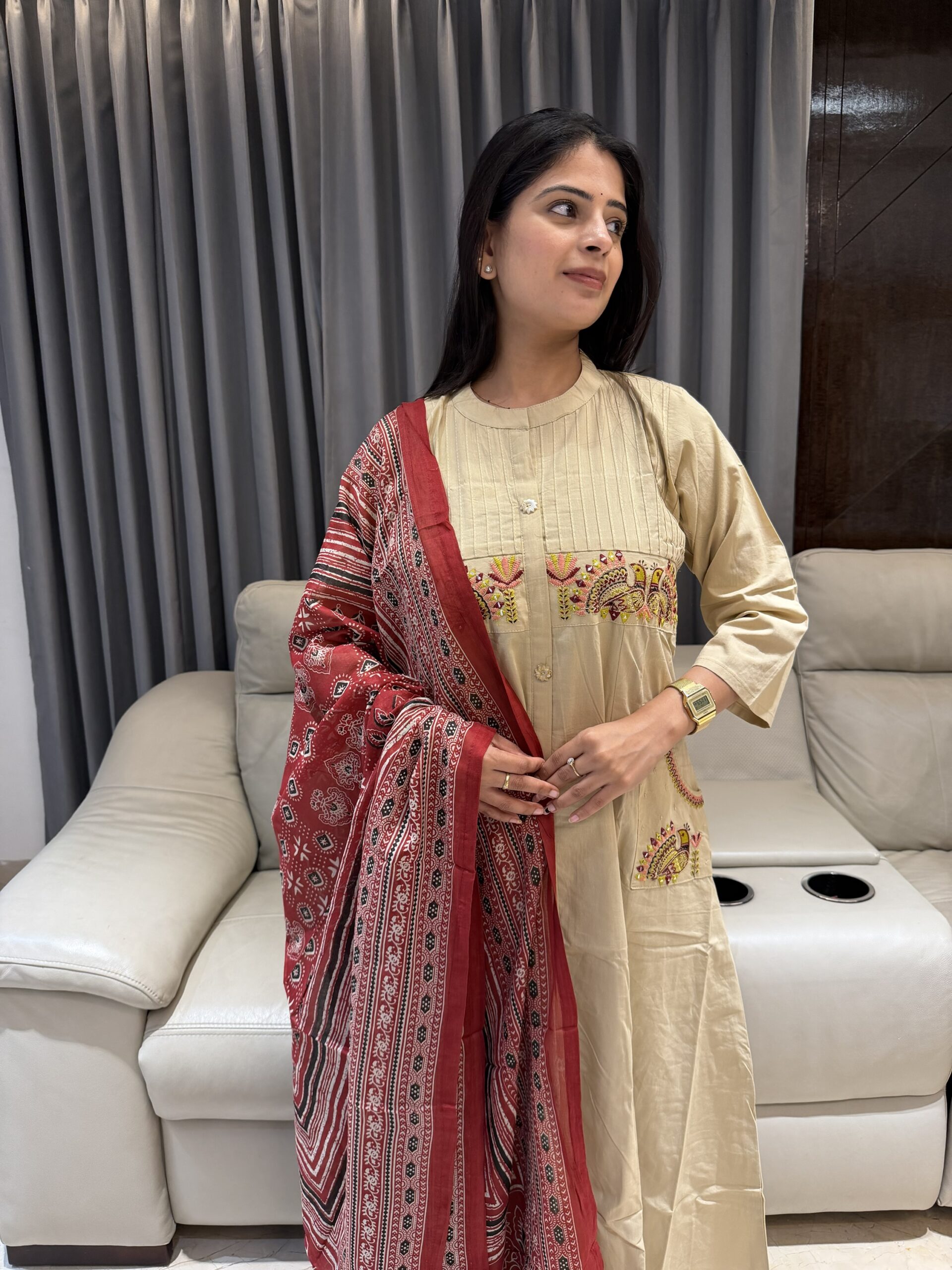 Featuring a soothing beige kurta with delicate embroidery on the yoke & pockets, paired with comfy straight pants and a stunning red hand block–printed dupatta ❤️