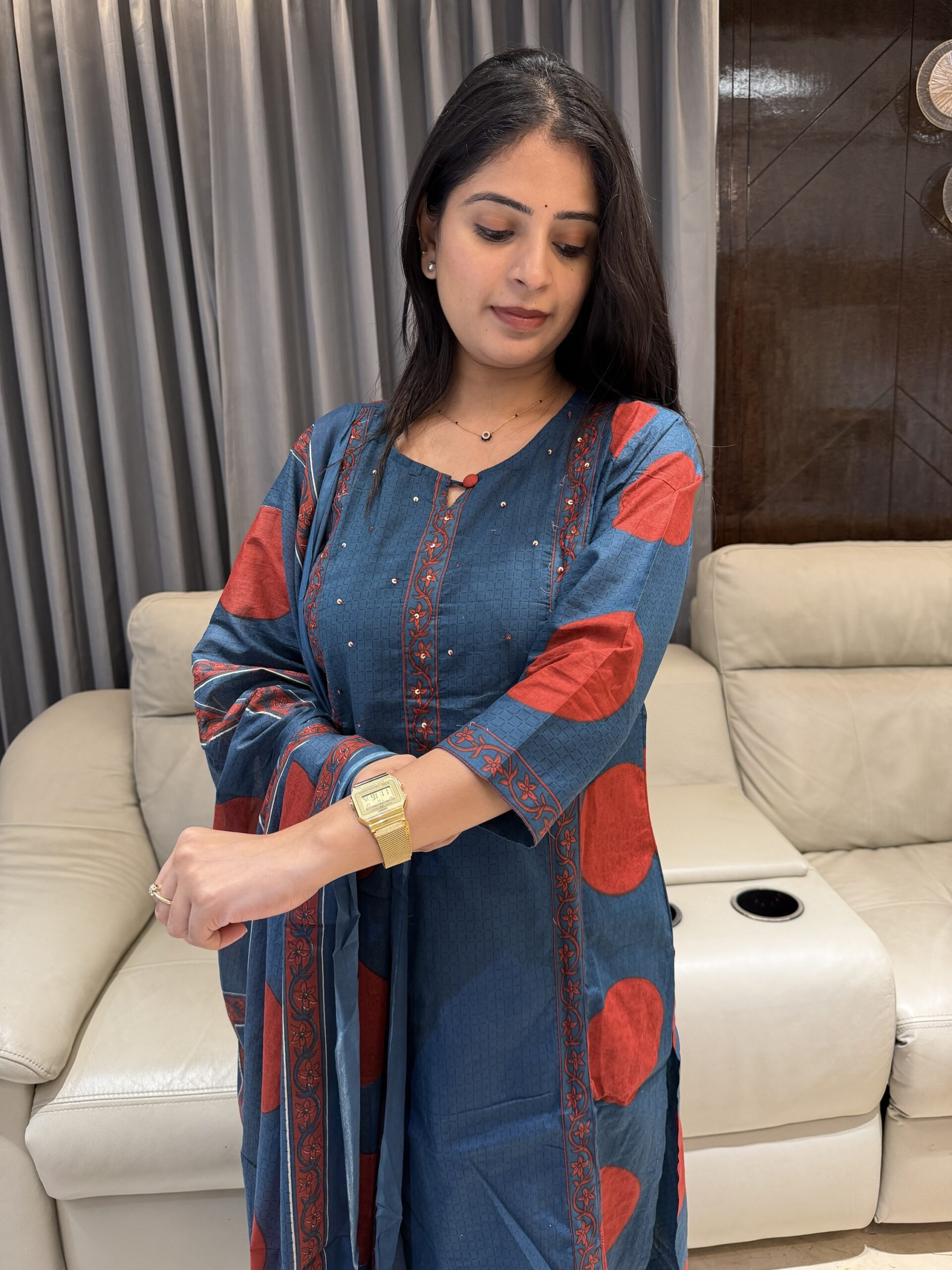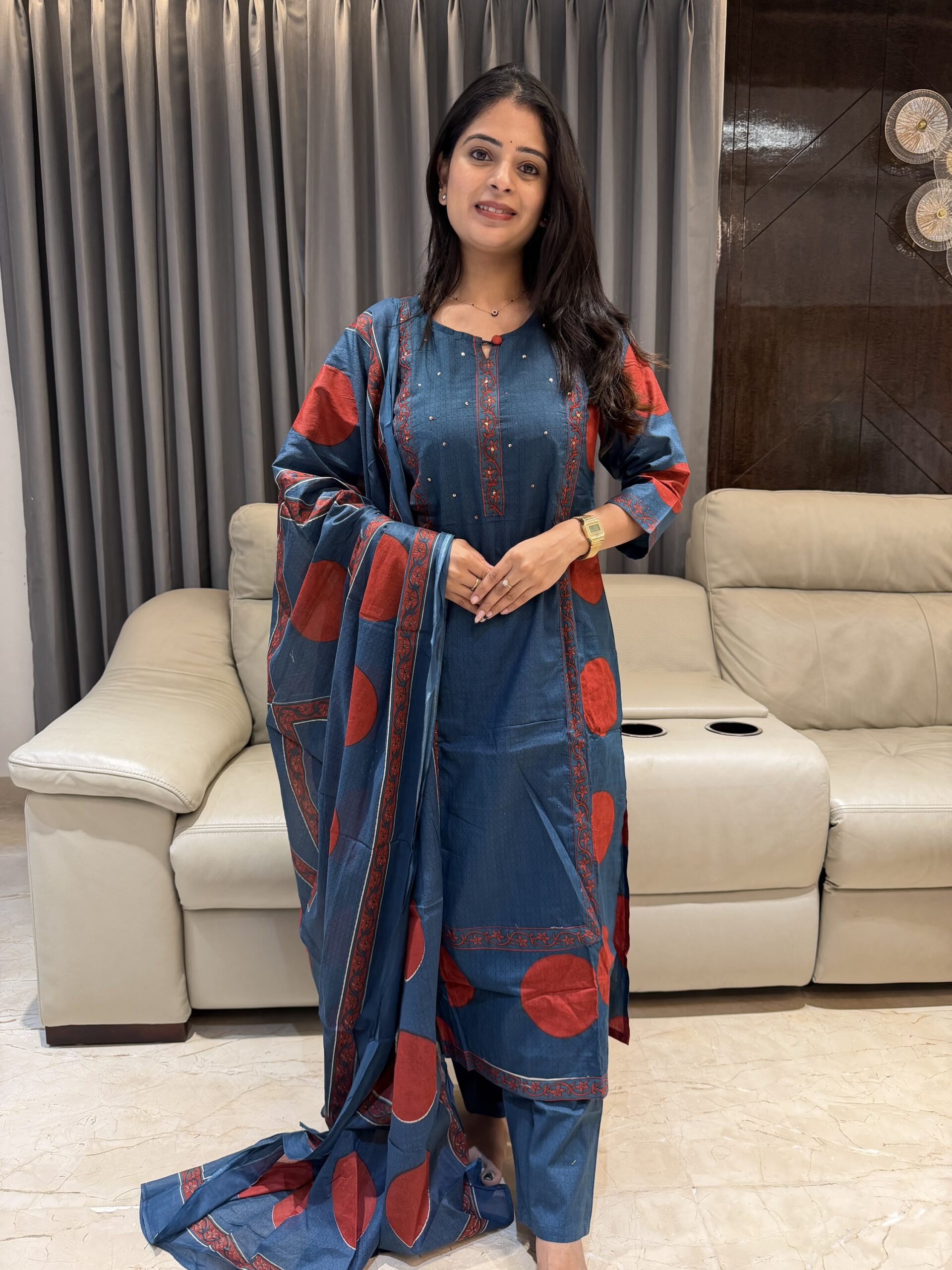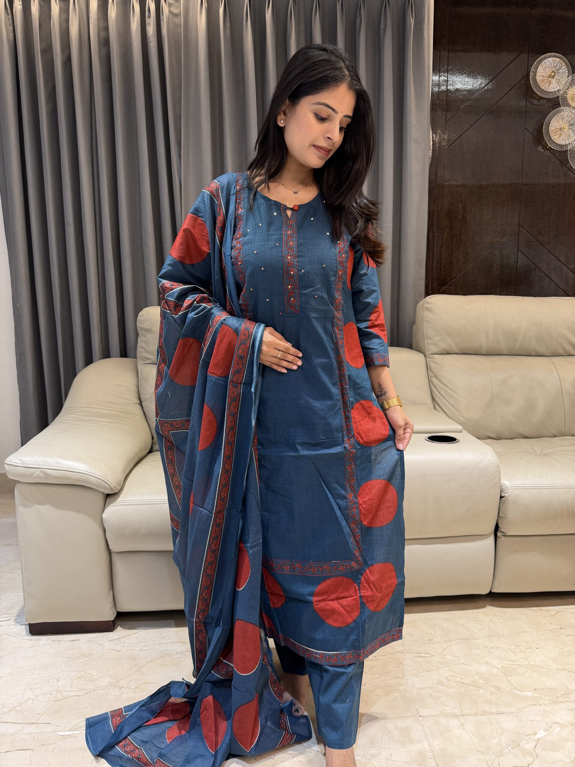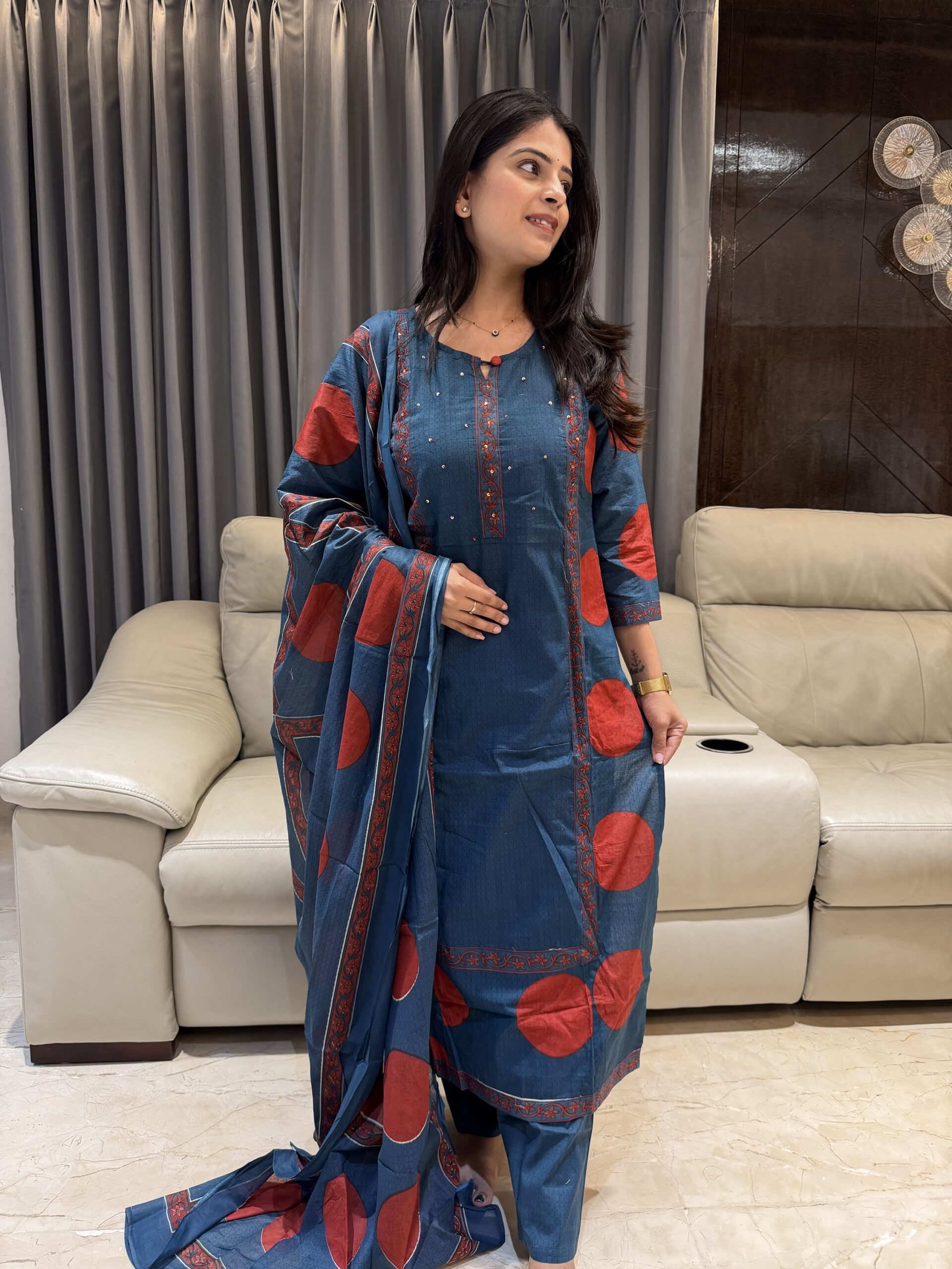 This beautiful kurta set features a rich teal blue base highlighted with bold red polka motifs and delicate border detailing. Paired with straight-fit pants and a flowy, statement dupatta, it’s the perfect blend of comfort and classic charm.