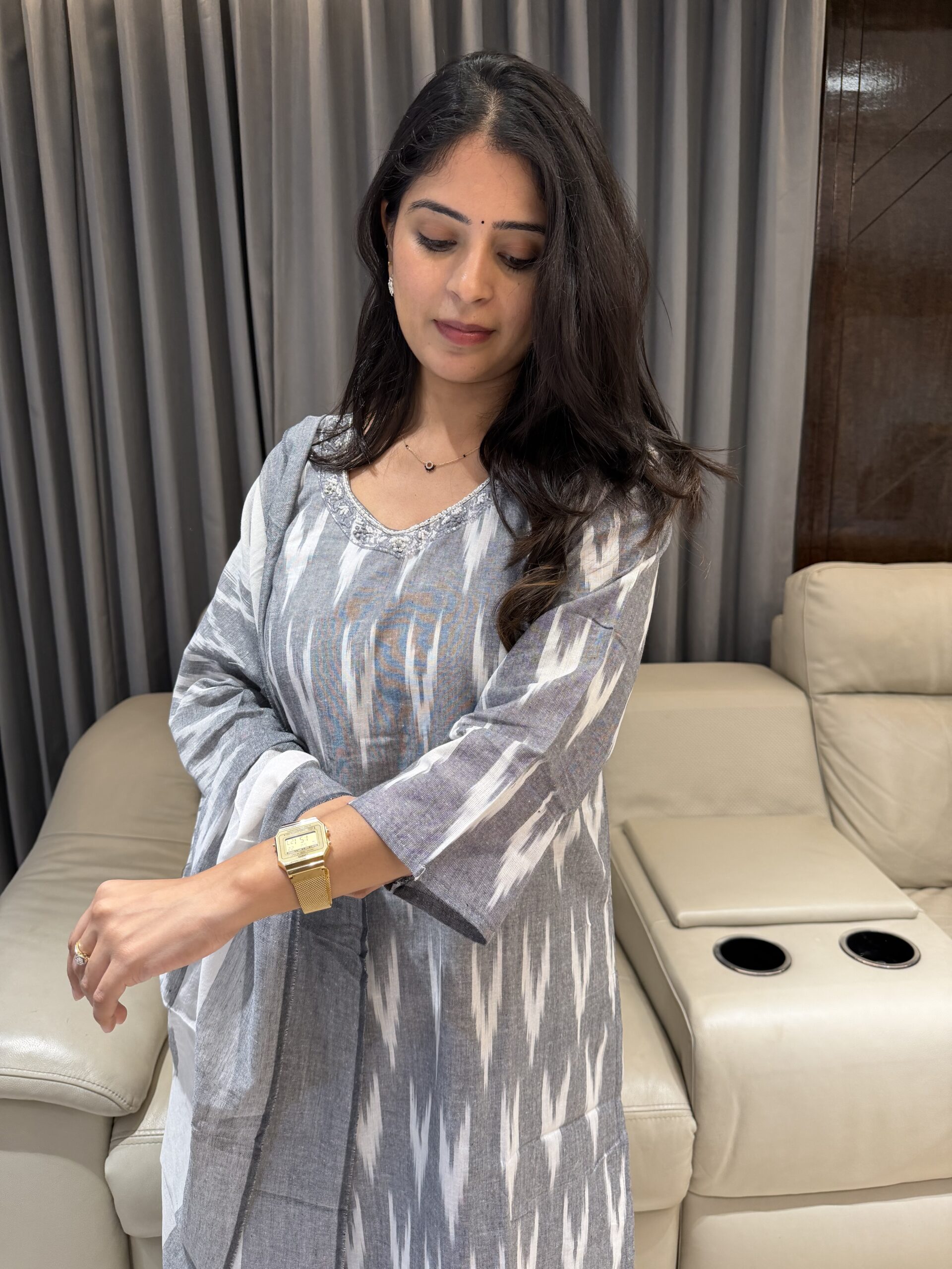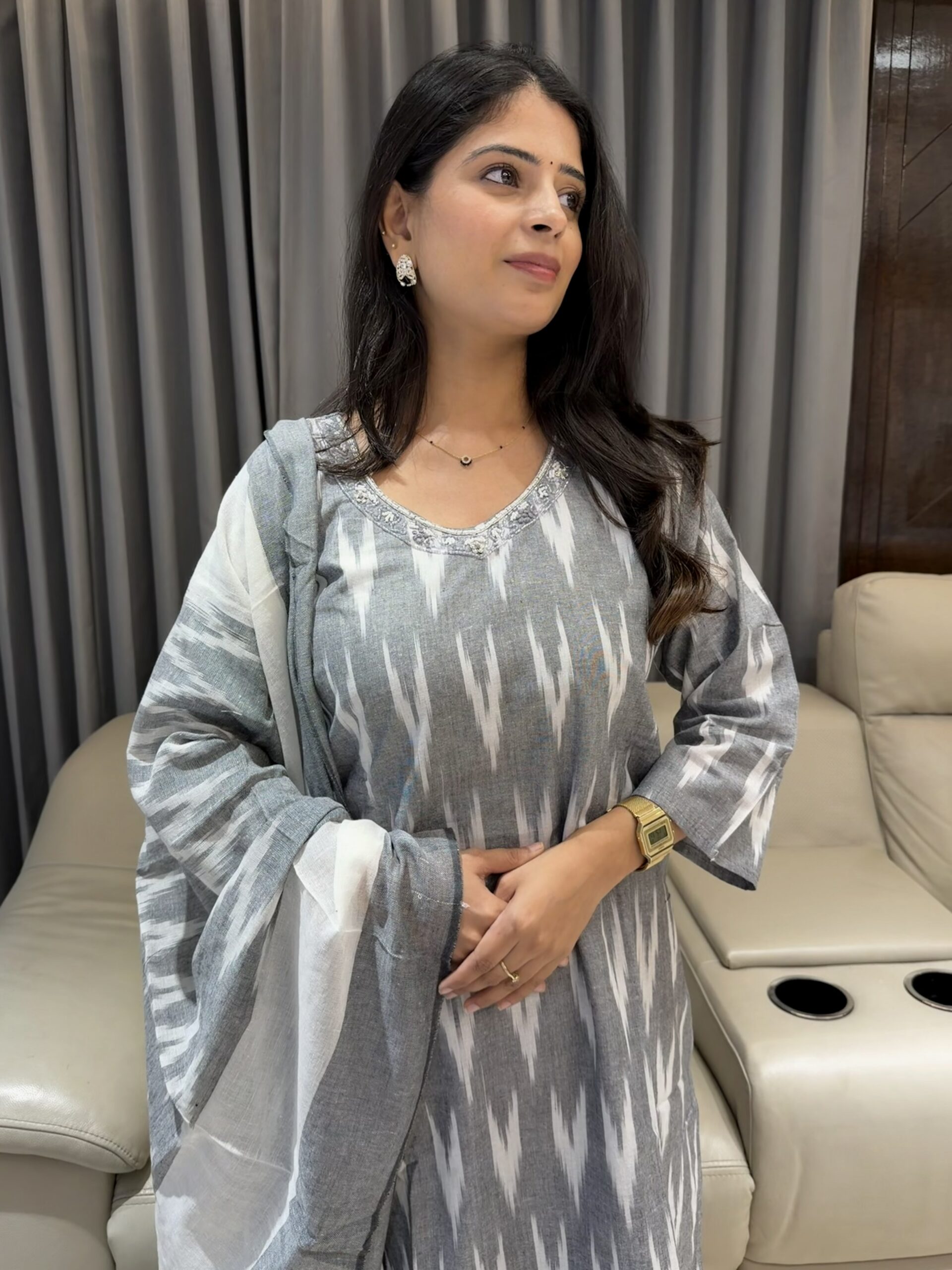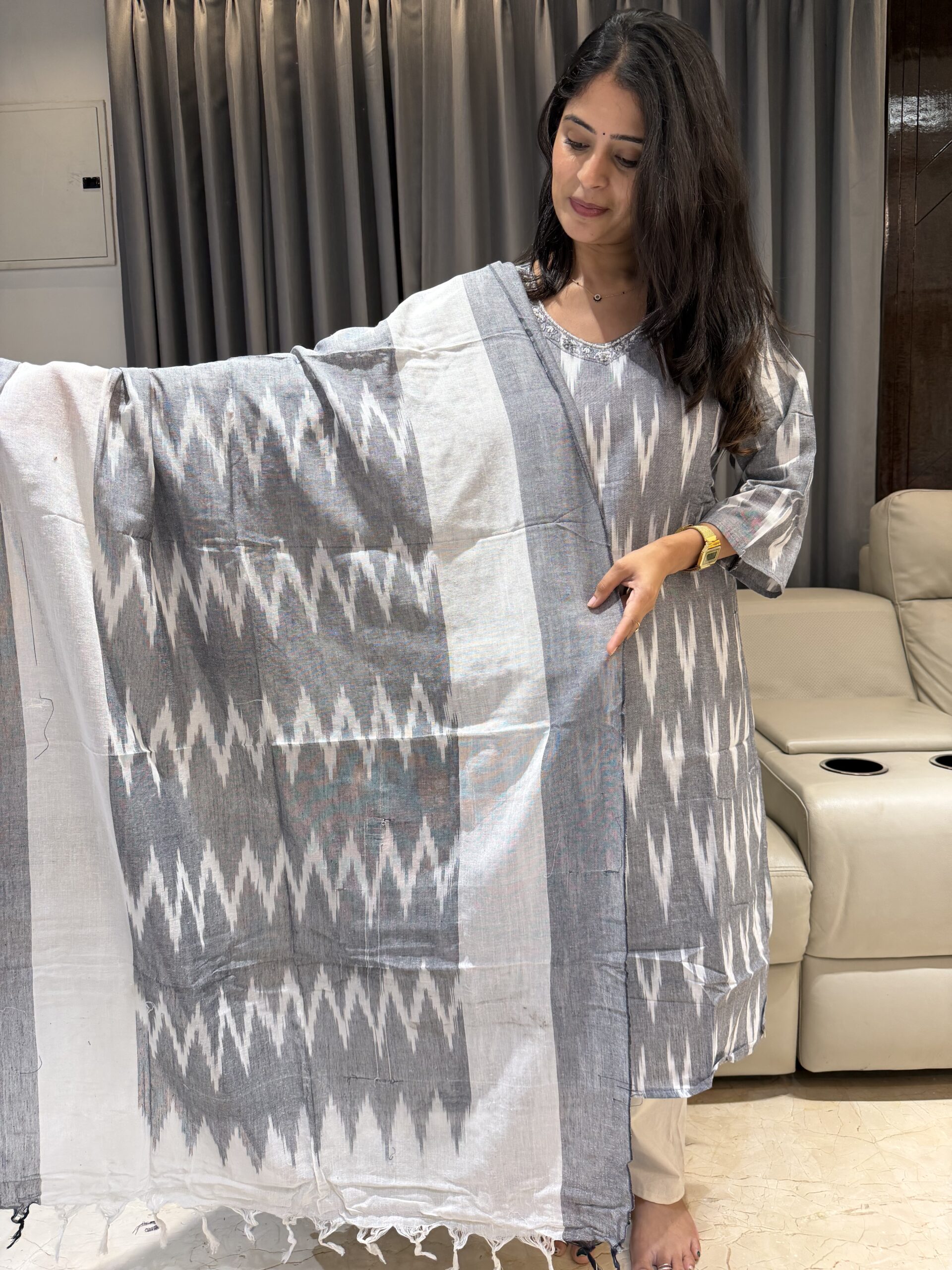 This grey & white Ikat kurta set is crafted for comfort and timeless style.