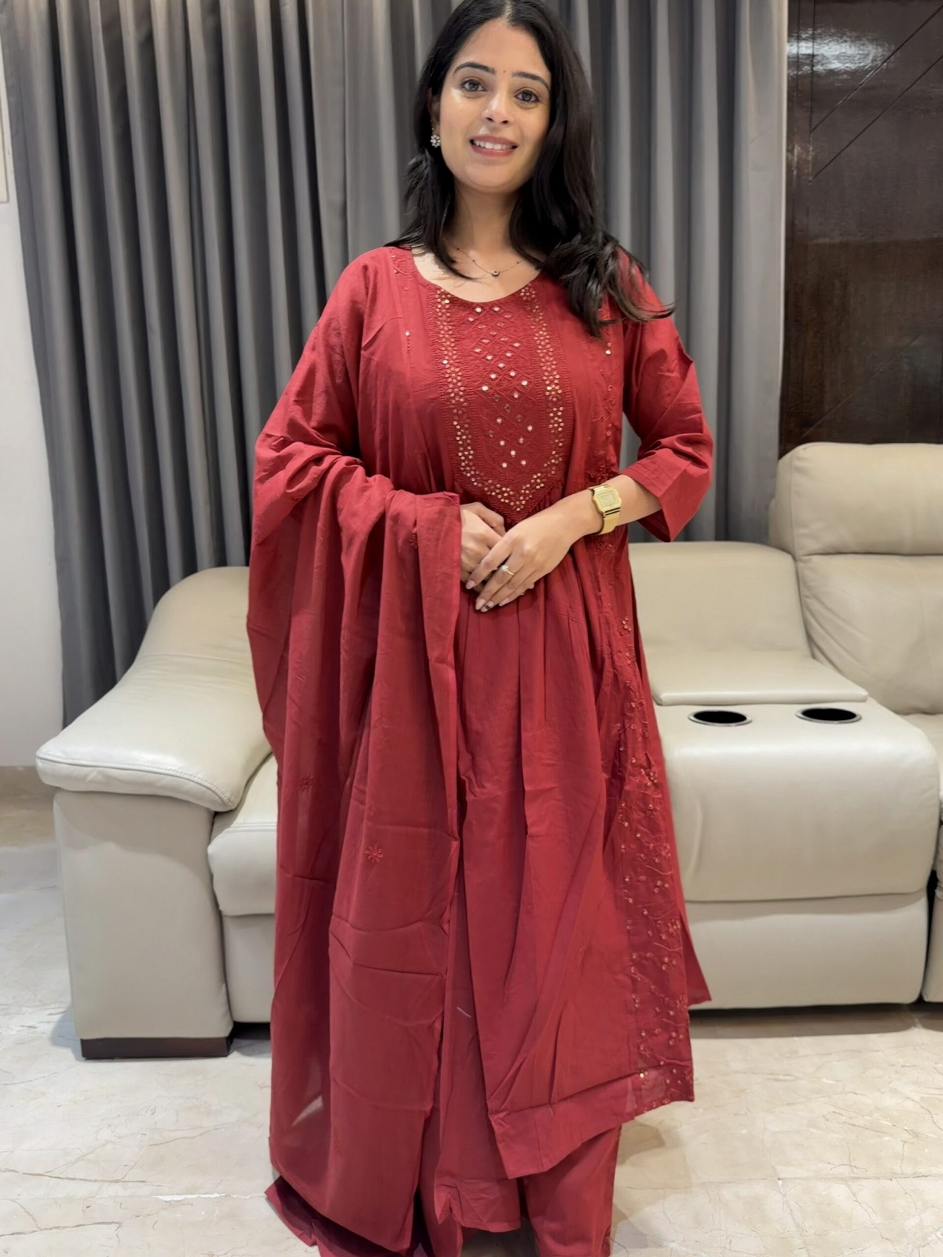 Step into festive glam with this premium pure Jaipur cotton kurta set crafted for comfort and statement looks. Featuring heavy sequence work running beautifully on the sides and detailed yoke part of the kurta, this outfit blends grace with subtle shimmer.