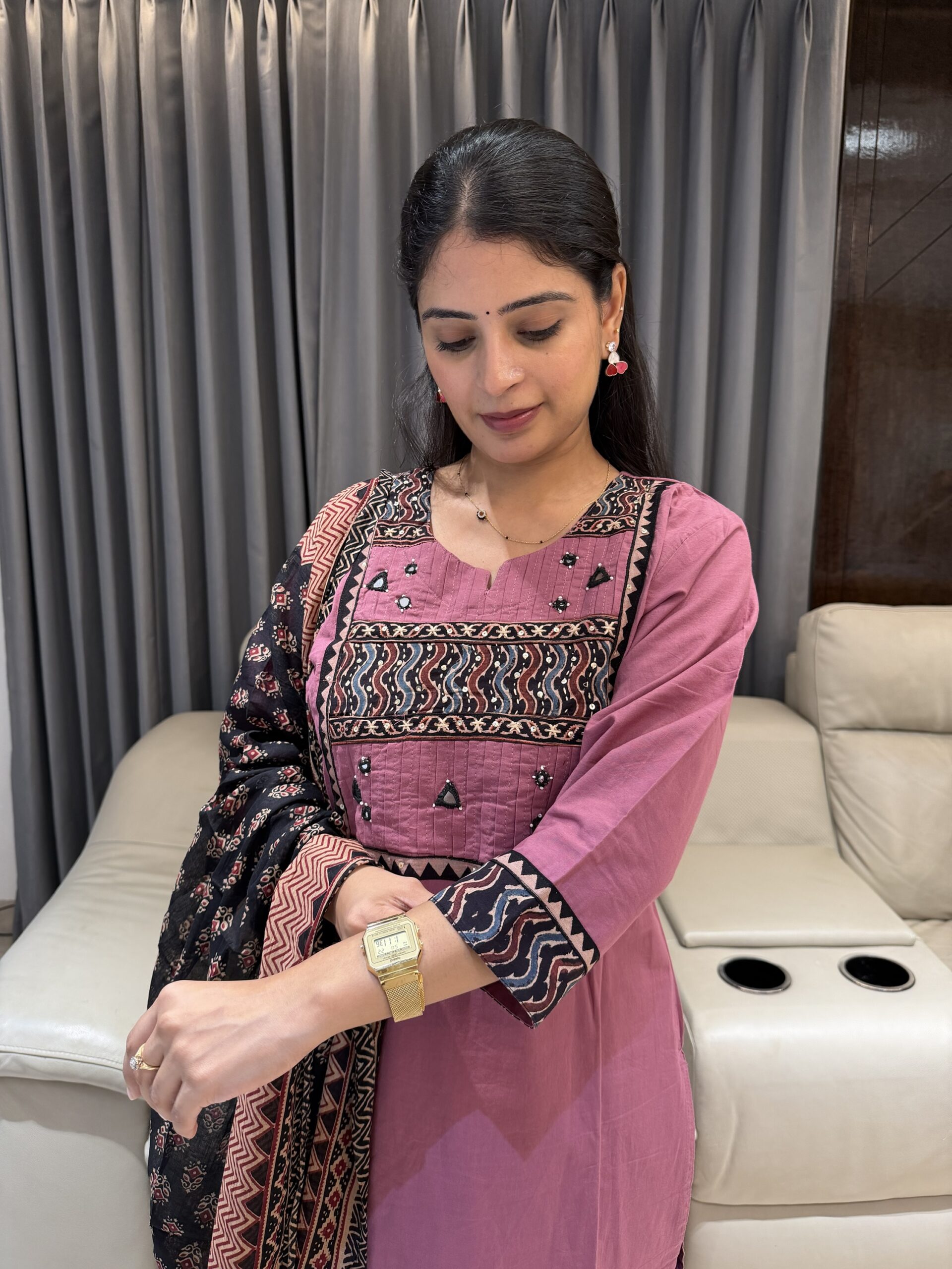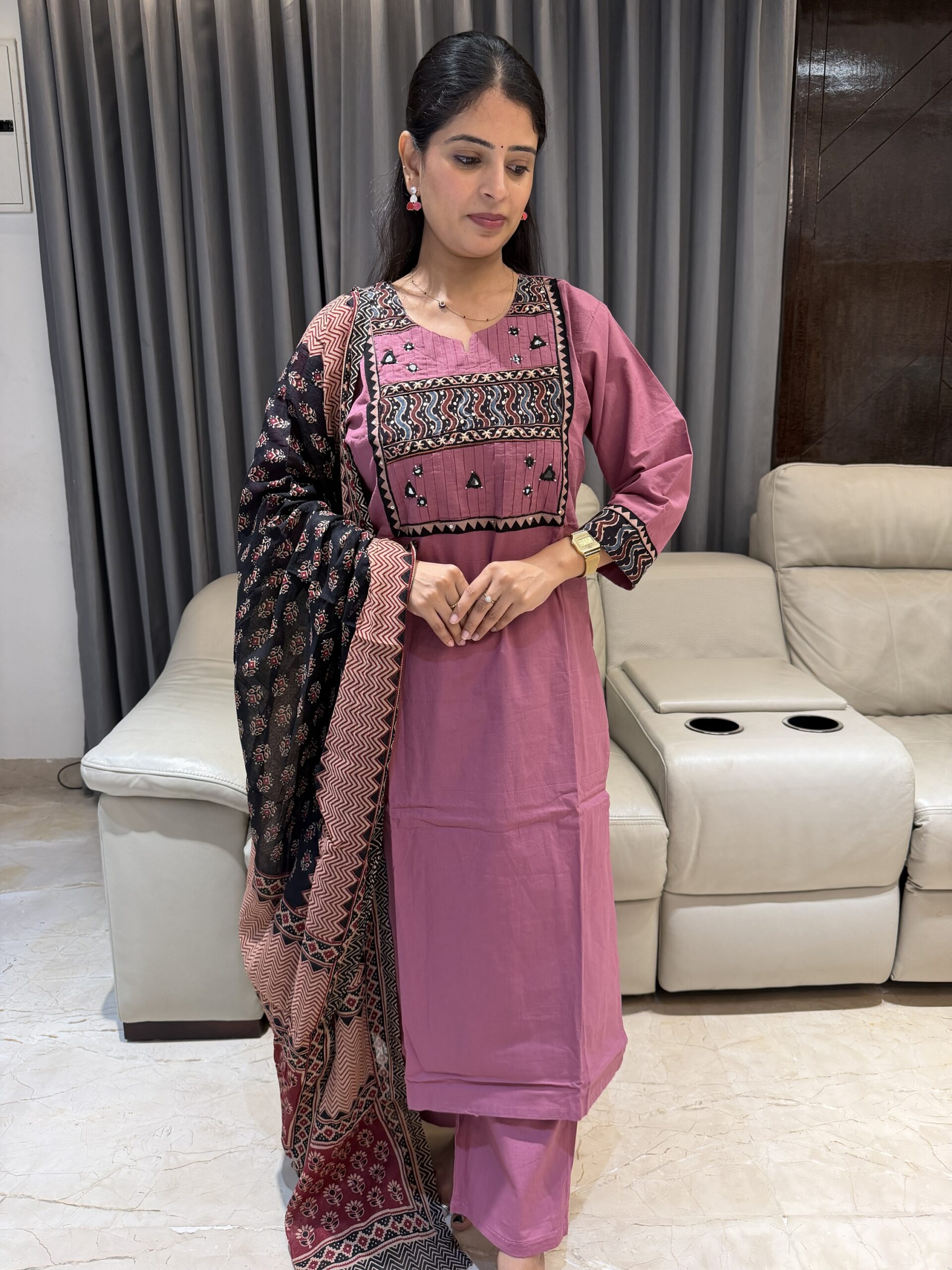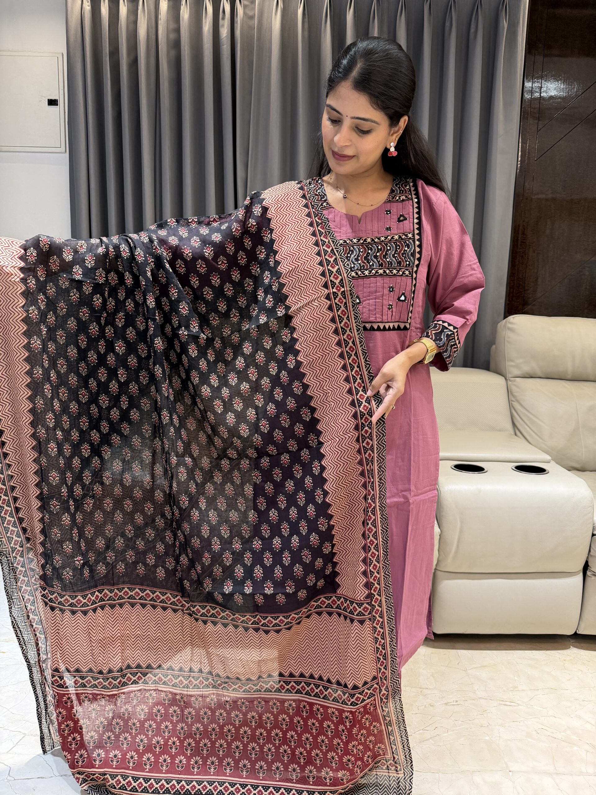 This pure cotton kurta set is all about comfort and classic ethnic charm. Featuring detailed neckline work and paired with a stunning Ajrakh dupatta in rich earthy prints, this outfit blends handcrafted heritage with everyday elegance.