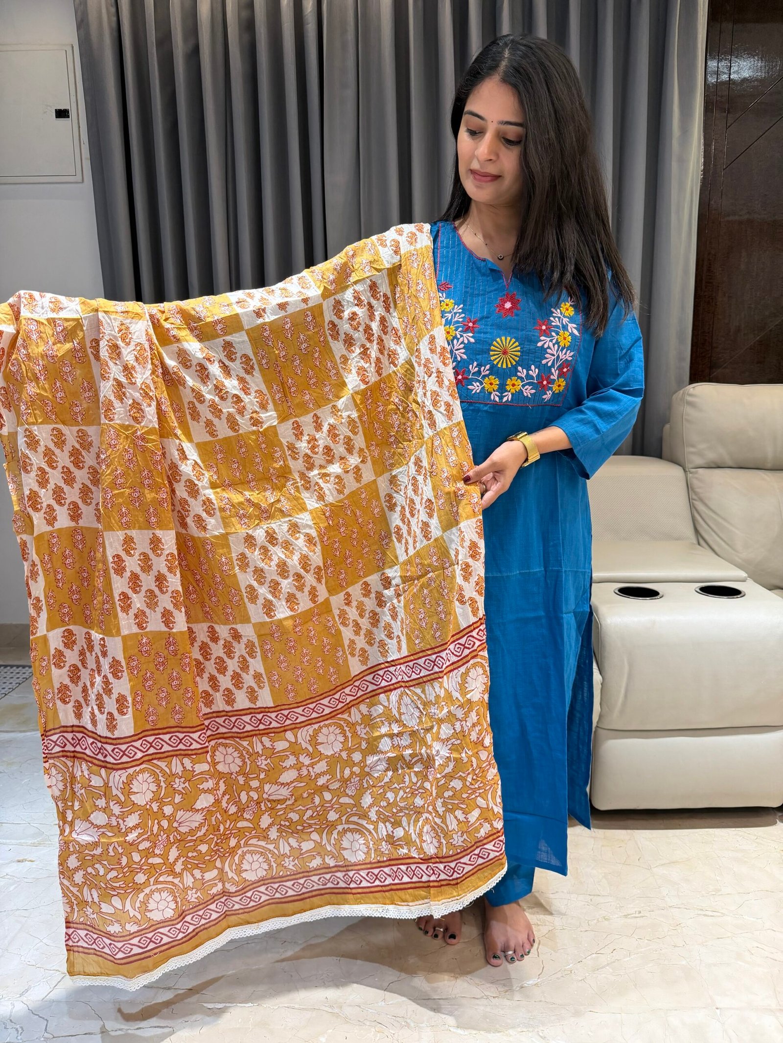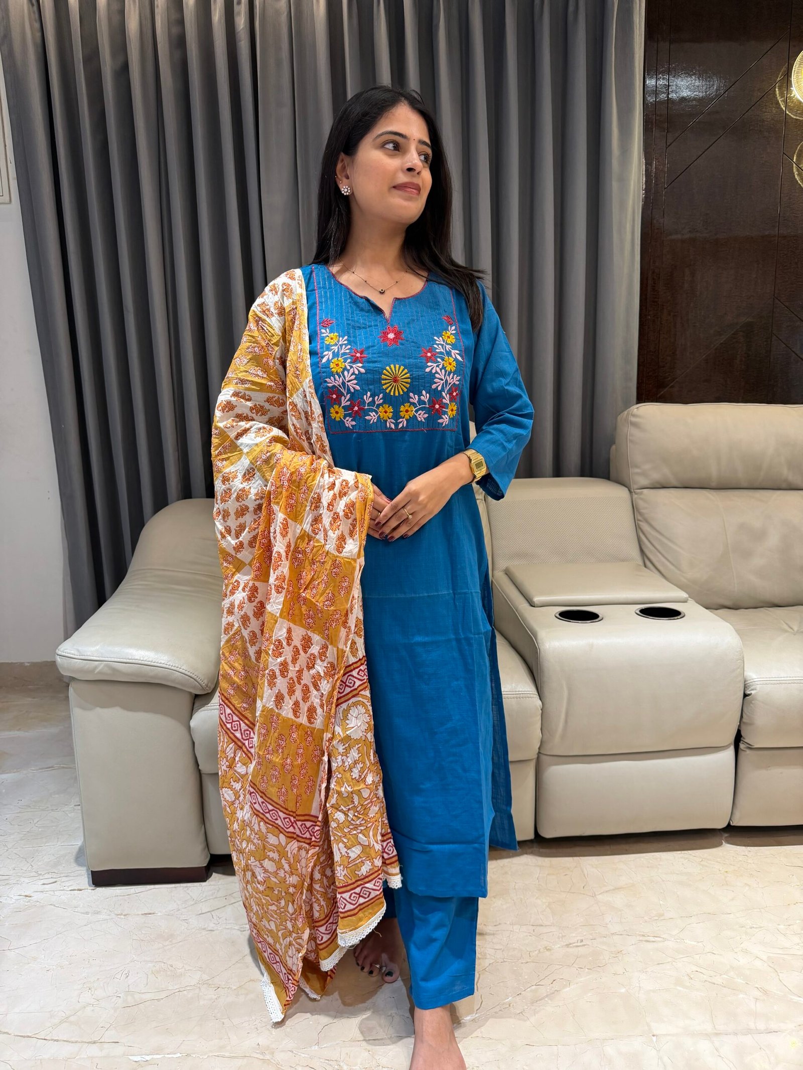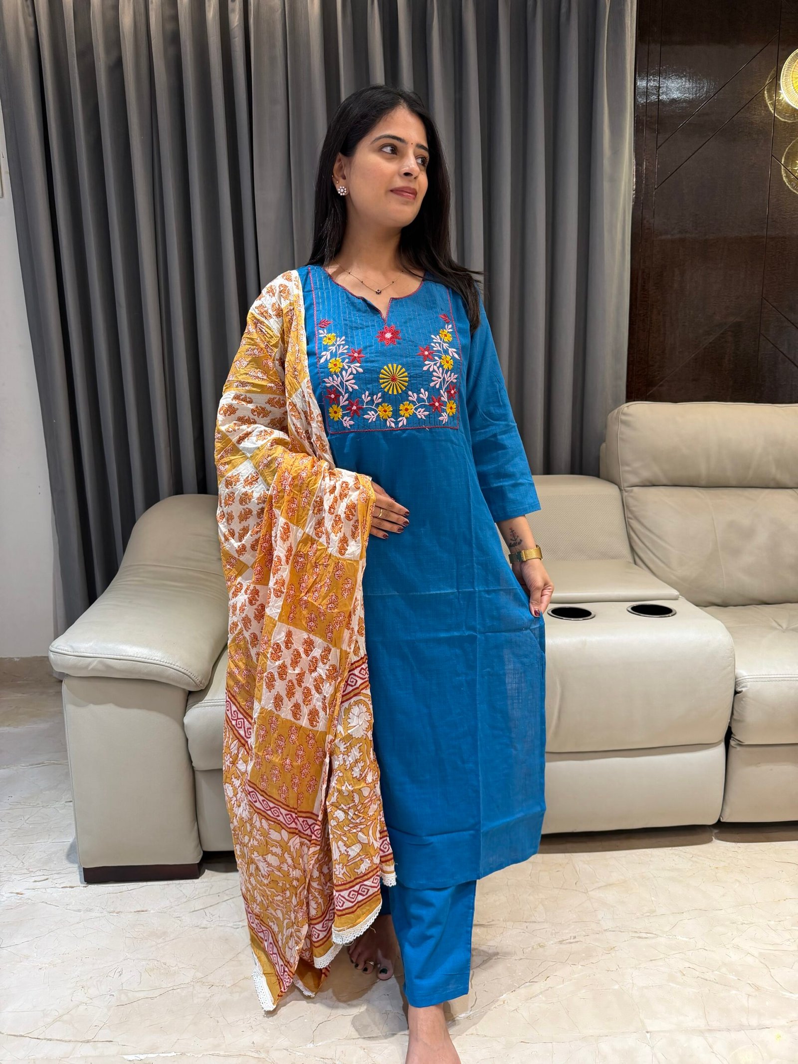 Crafted in soft breathable cotton, this kurta features elegant multicolor floral thread embroidery on the yoke, giving it a graceful ethnic touch. Paired with a mustard block printed cotton dupatta, the look is perfect for daily wear, office wear, college wear, or casual outings.