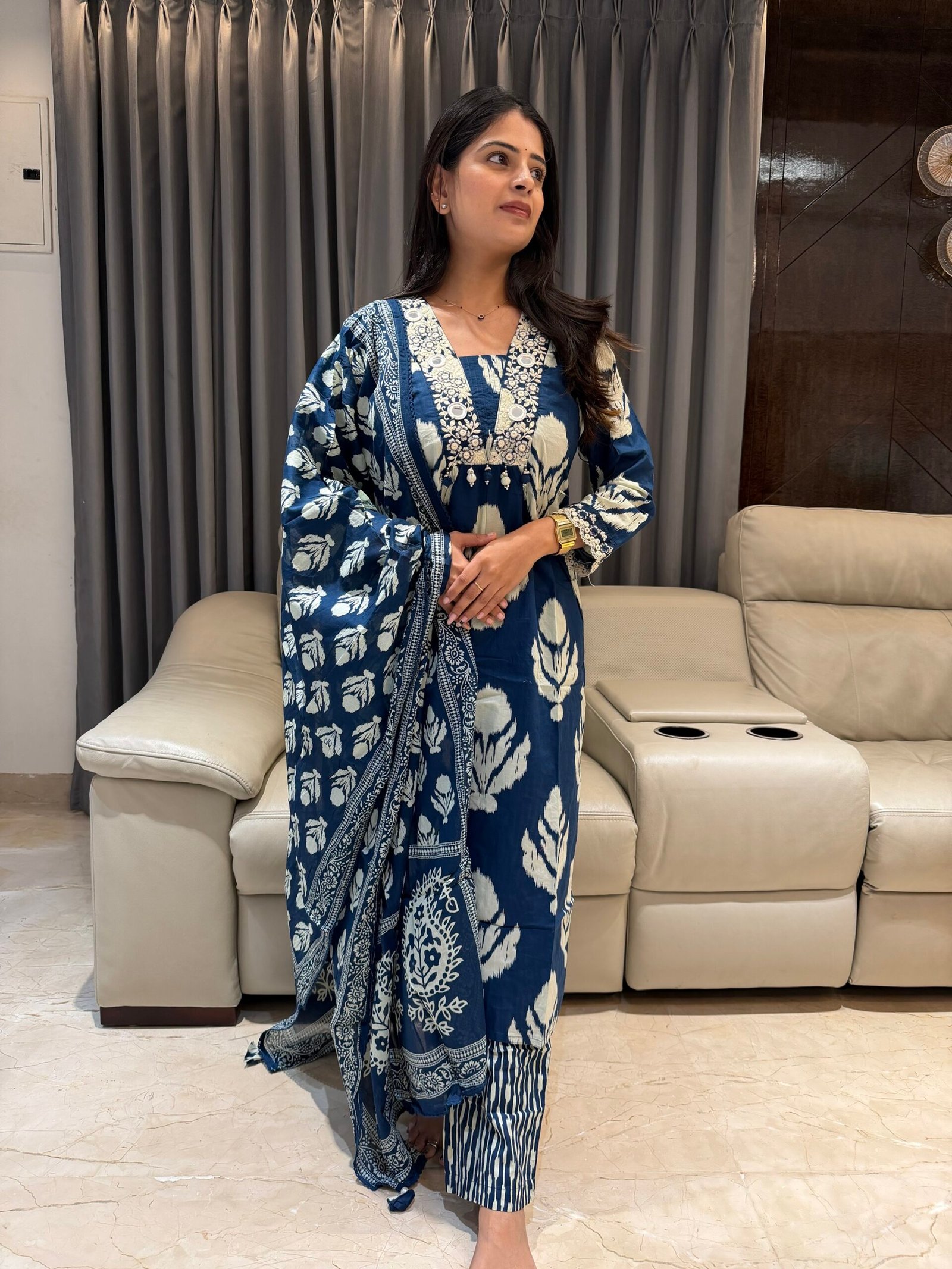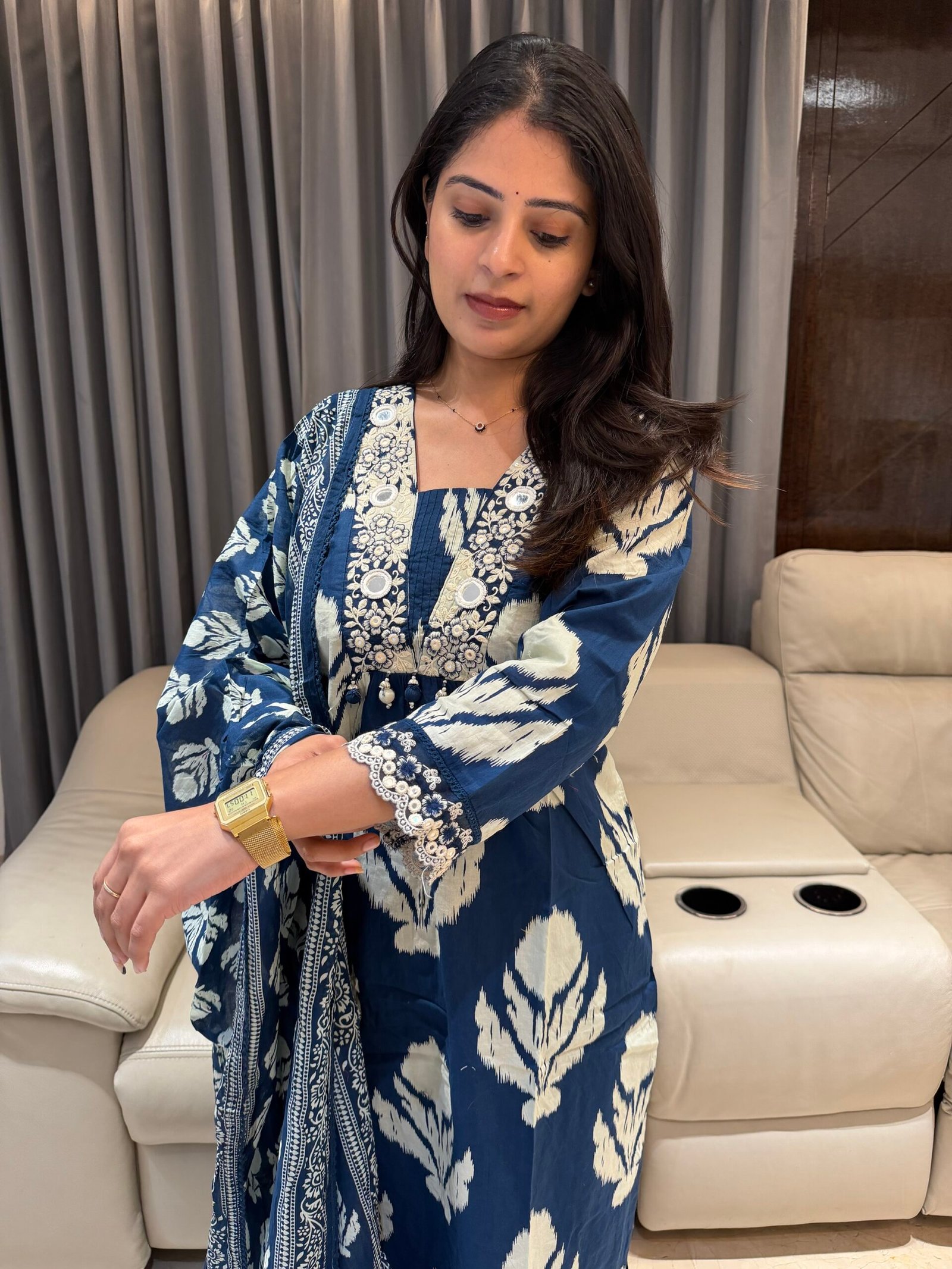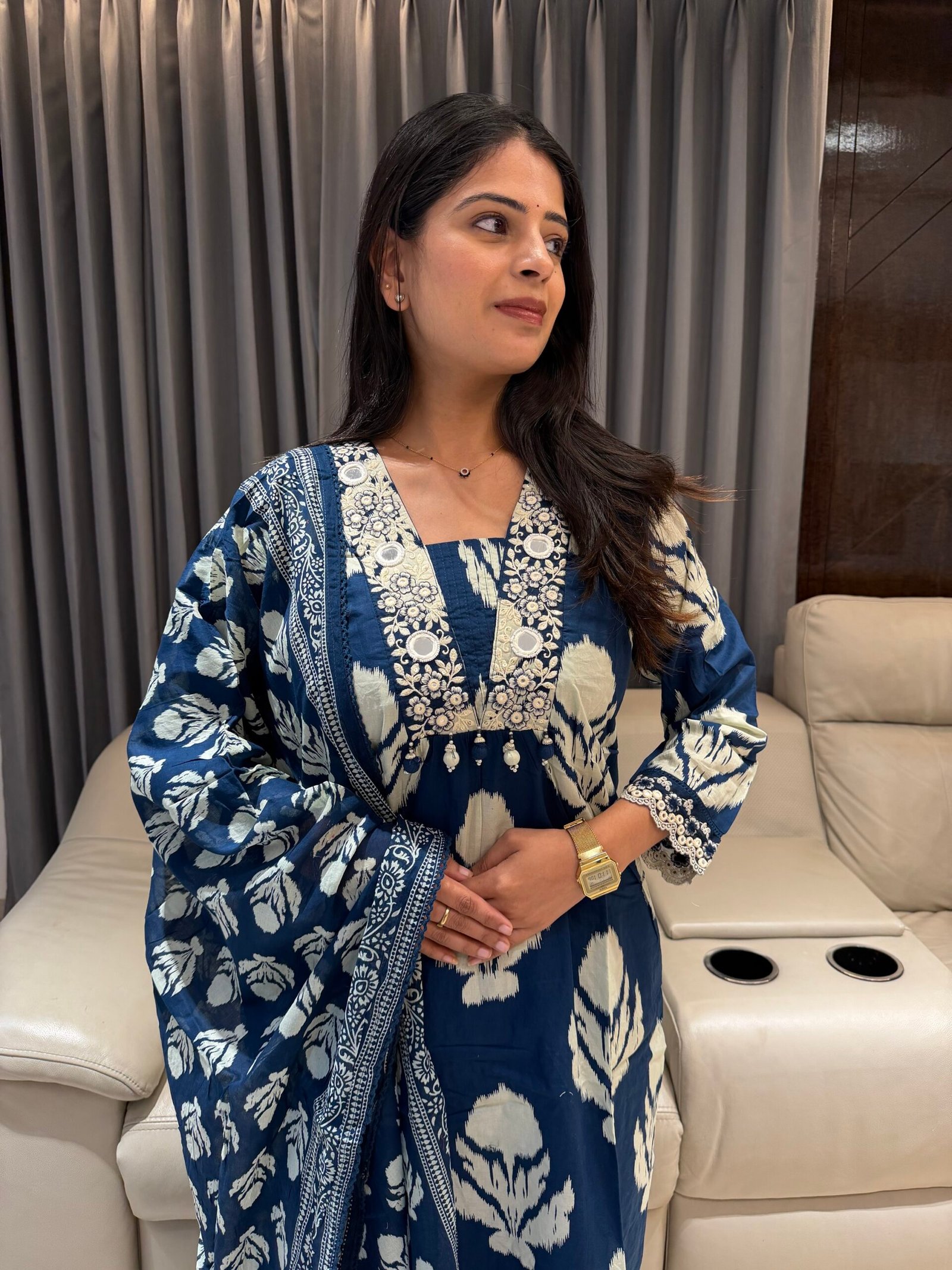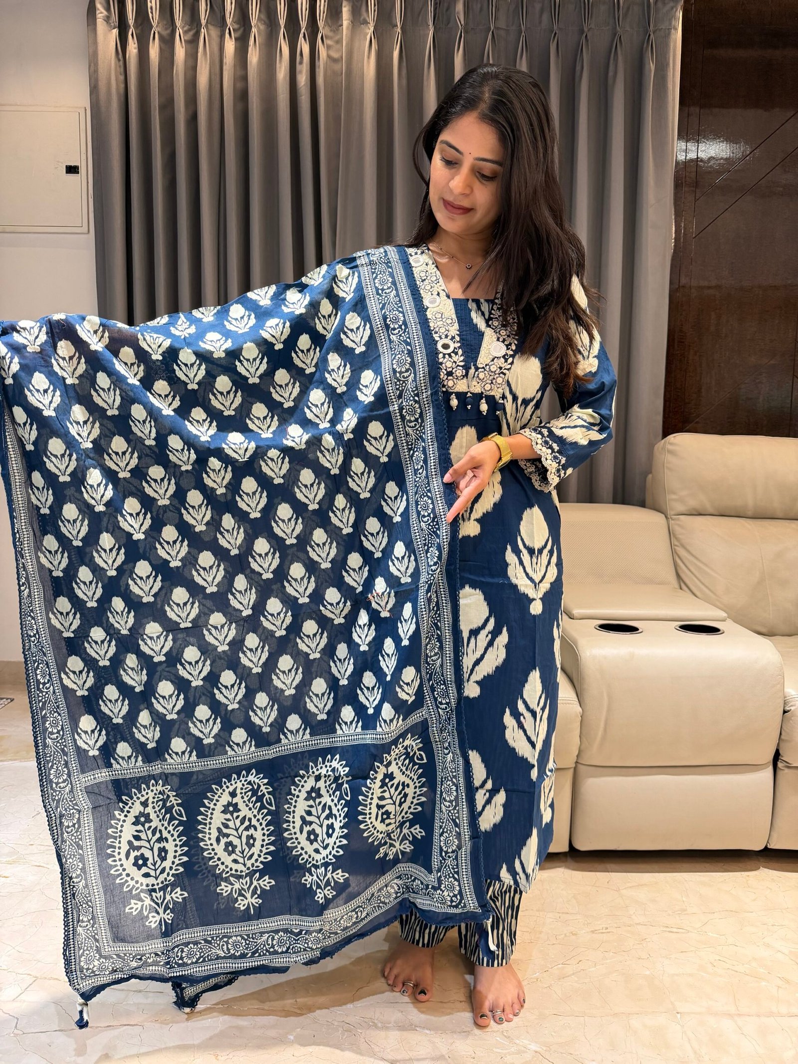 Step into timeless style with this premium cotton kurta set featuring intricate thread work & mirror work yoke that adds the perfect festive sparkle ✨ Paired with a beautifully printed dupatta, this look blends comfort with effortless grace.