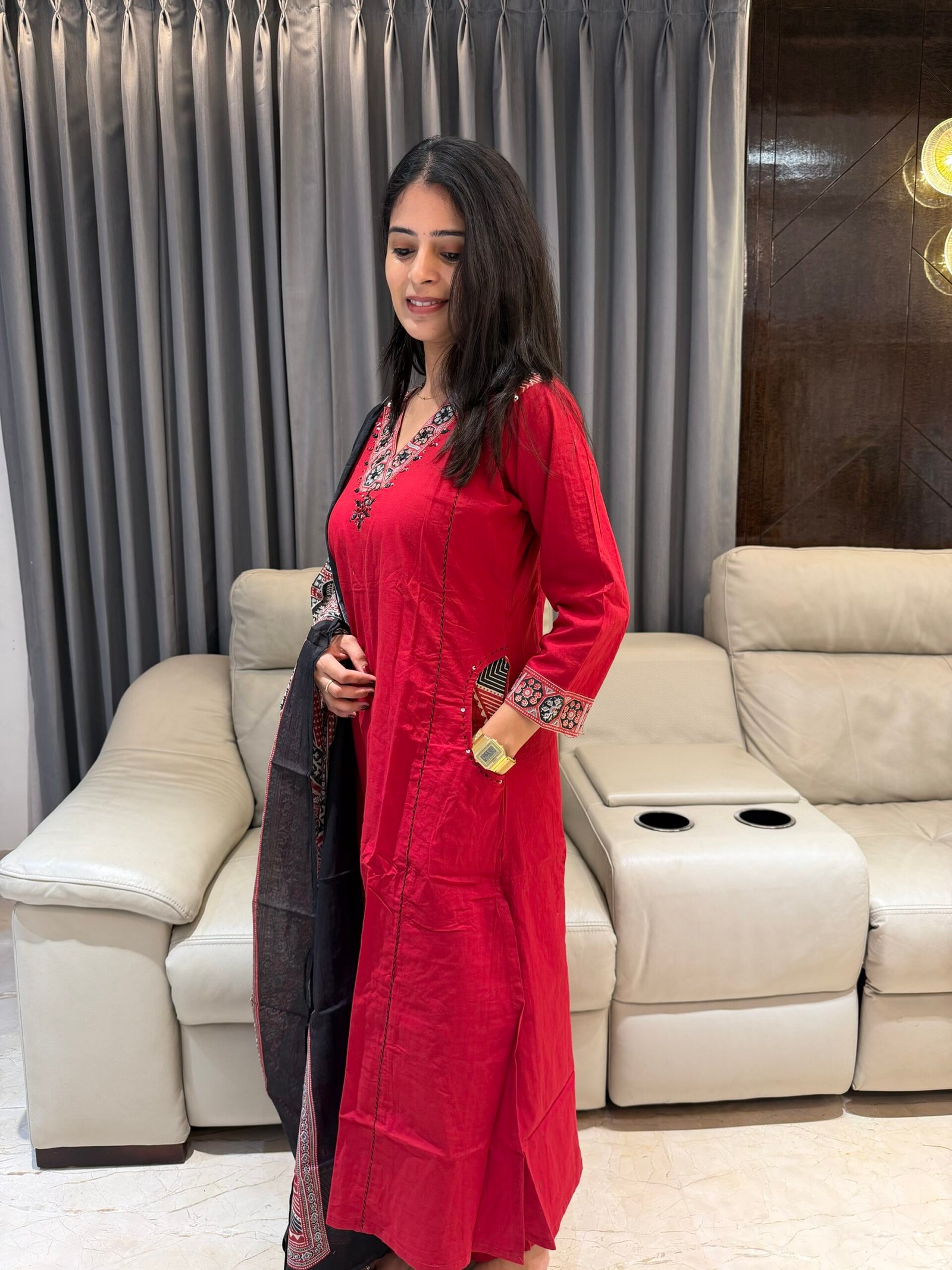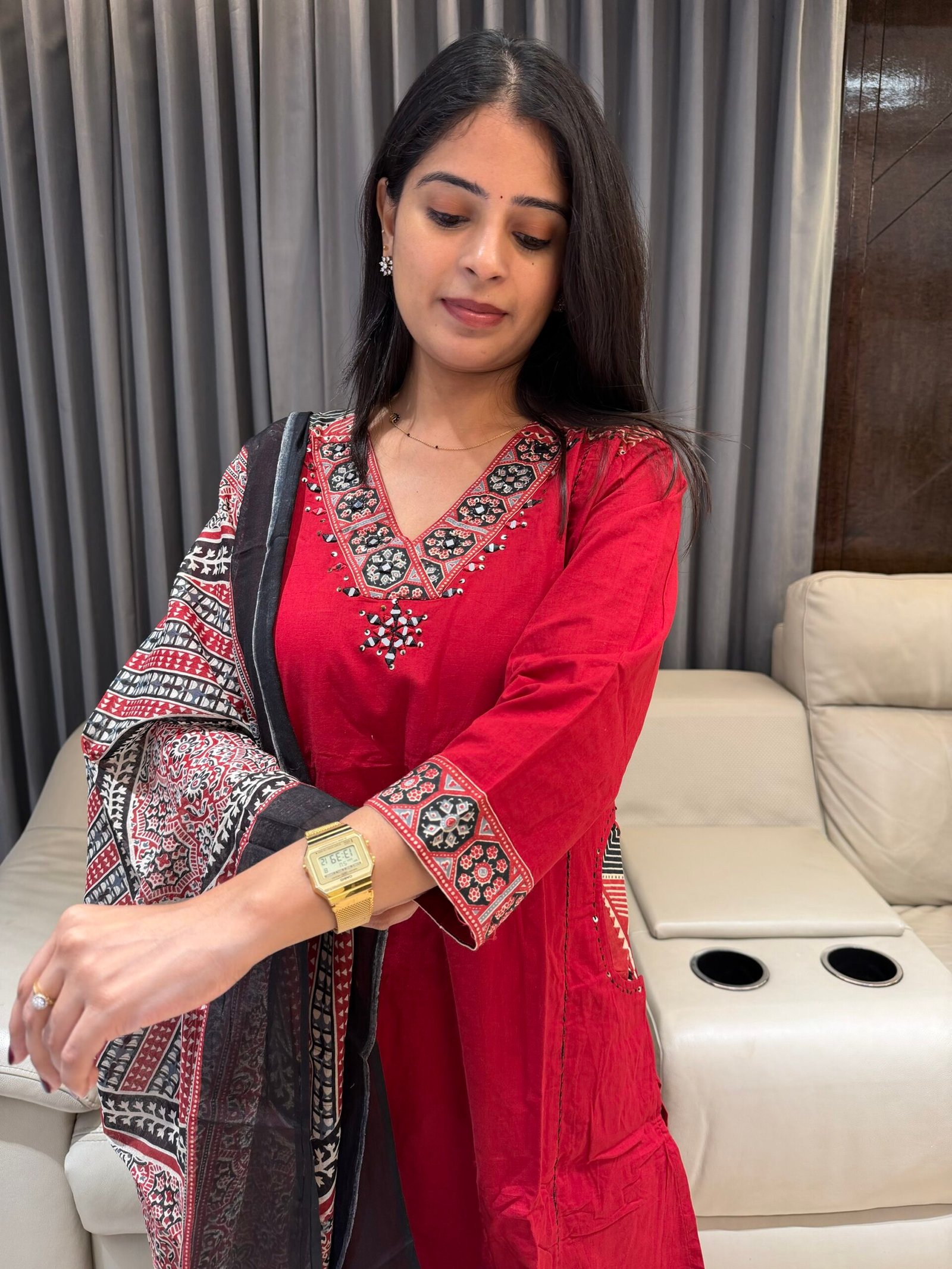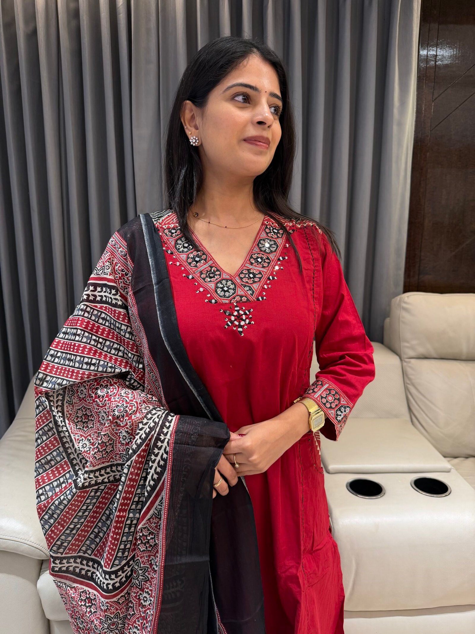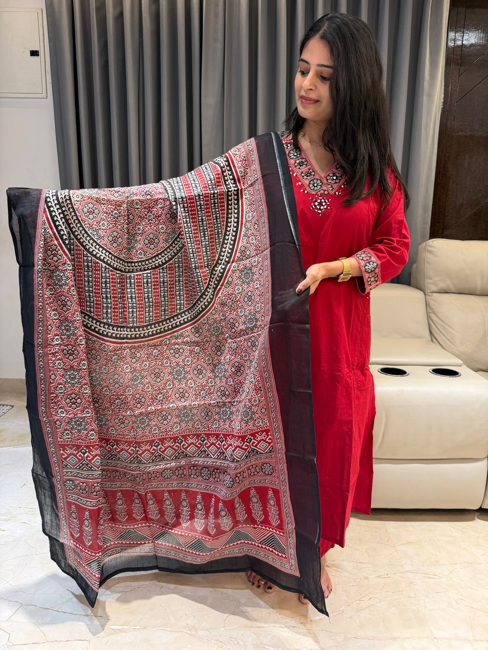 Make a statement in this stunning red kurta set paired with a beautifully detailed Ajrakh dupatta ❤️🖤