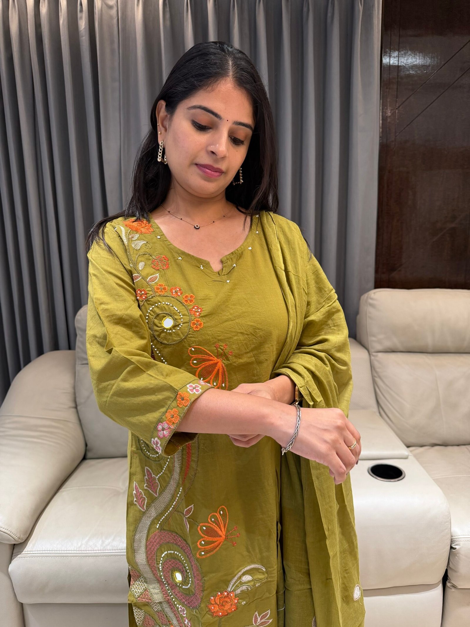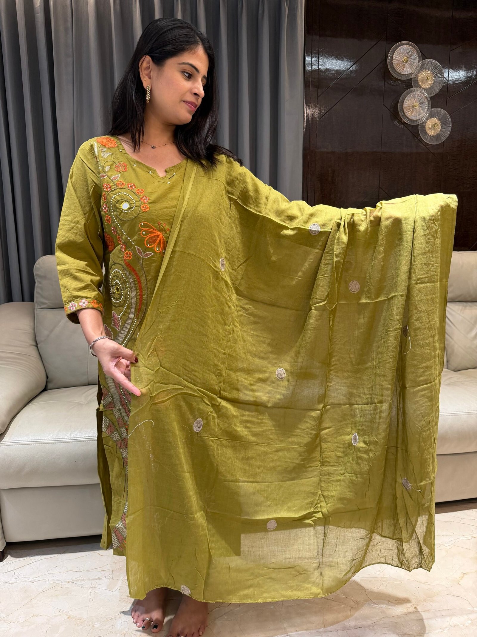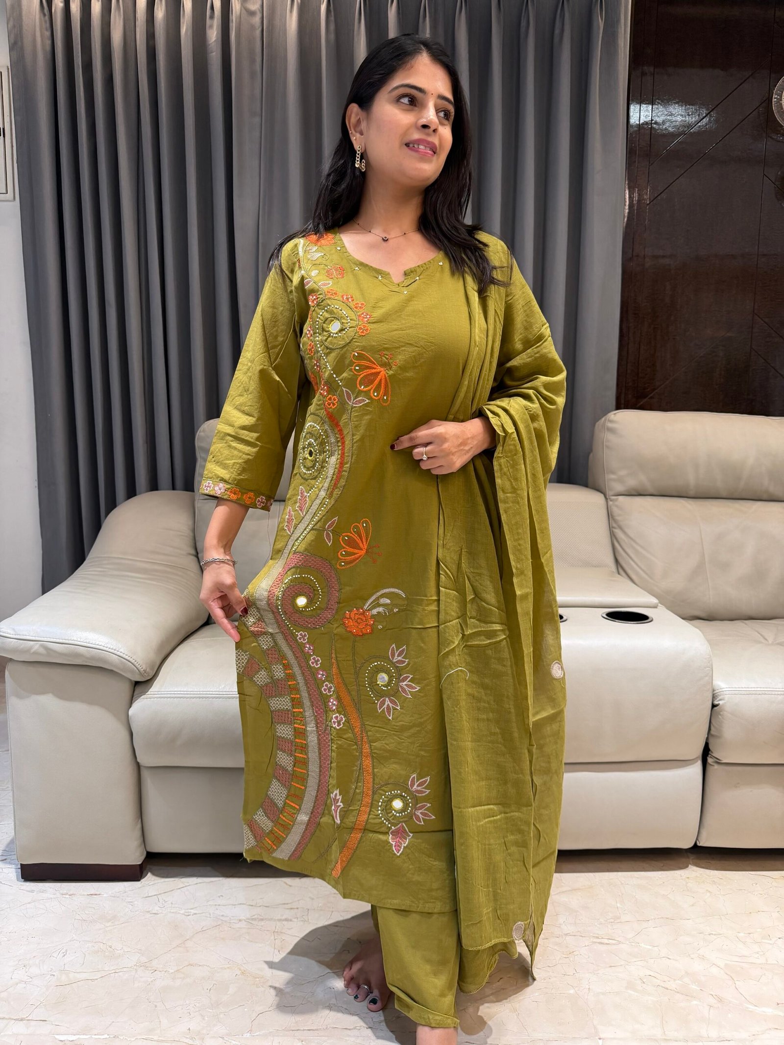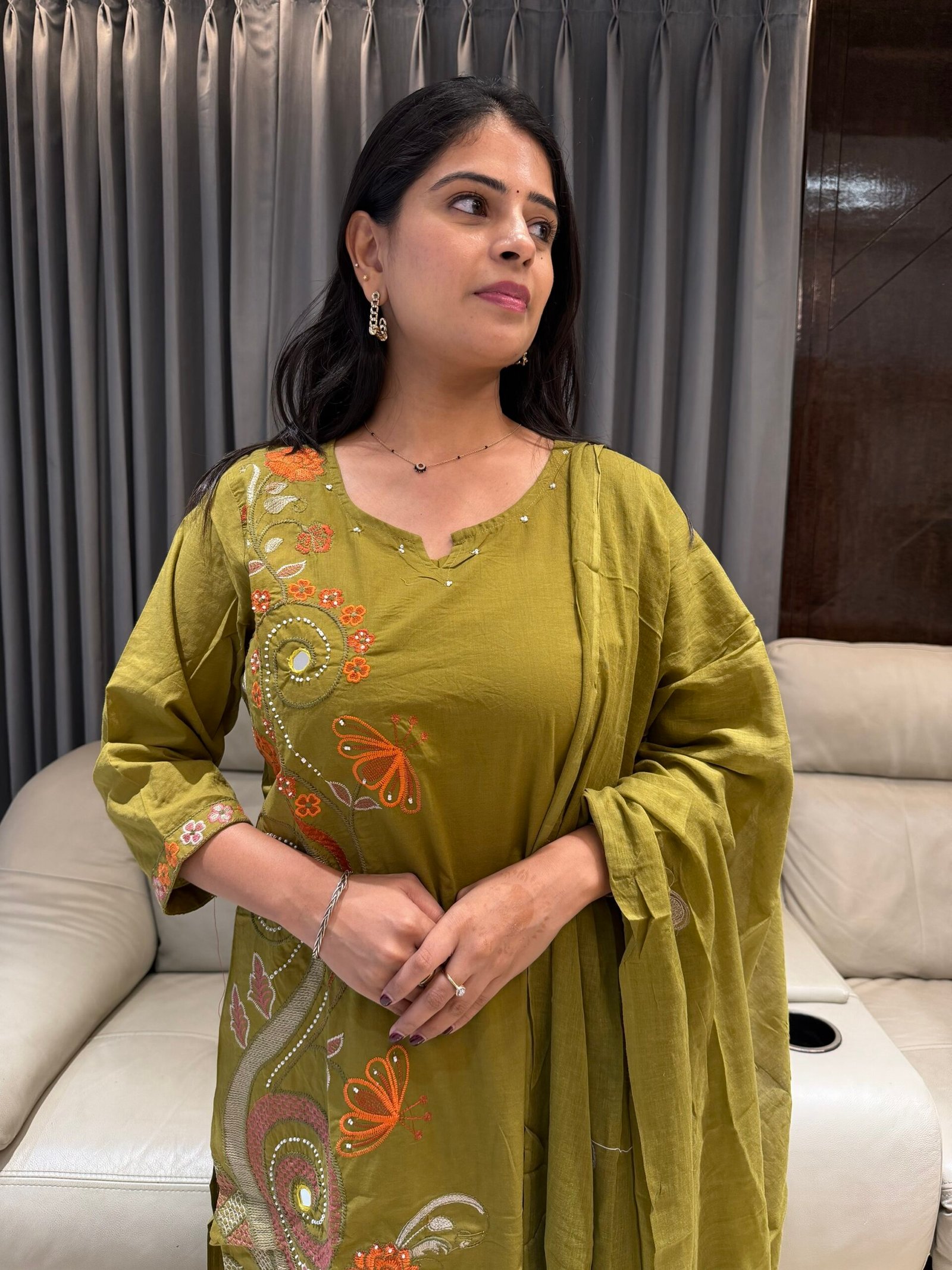 Make a statement in this stunning pure cotton kurta set featuring intricate hand embroidery & mirror detailing with a beautifully flowing lightweight dupatta 💚 Perfect blend of comfort and style for your everyday ethnic look!