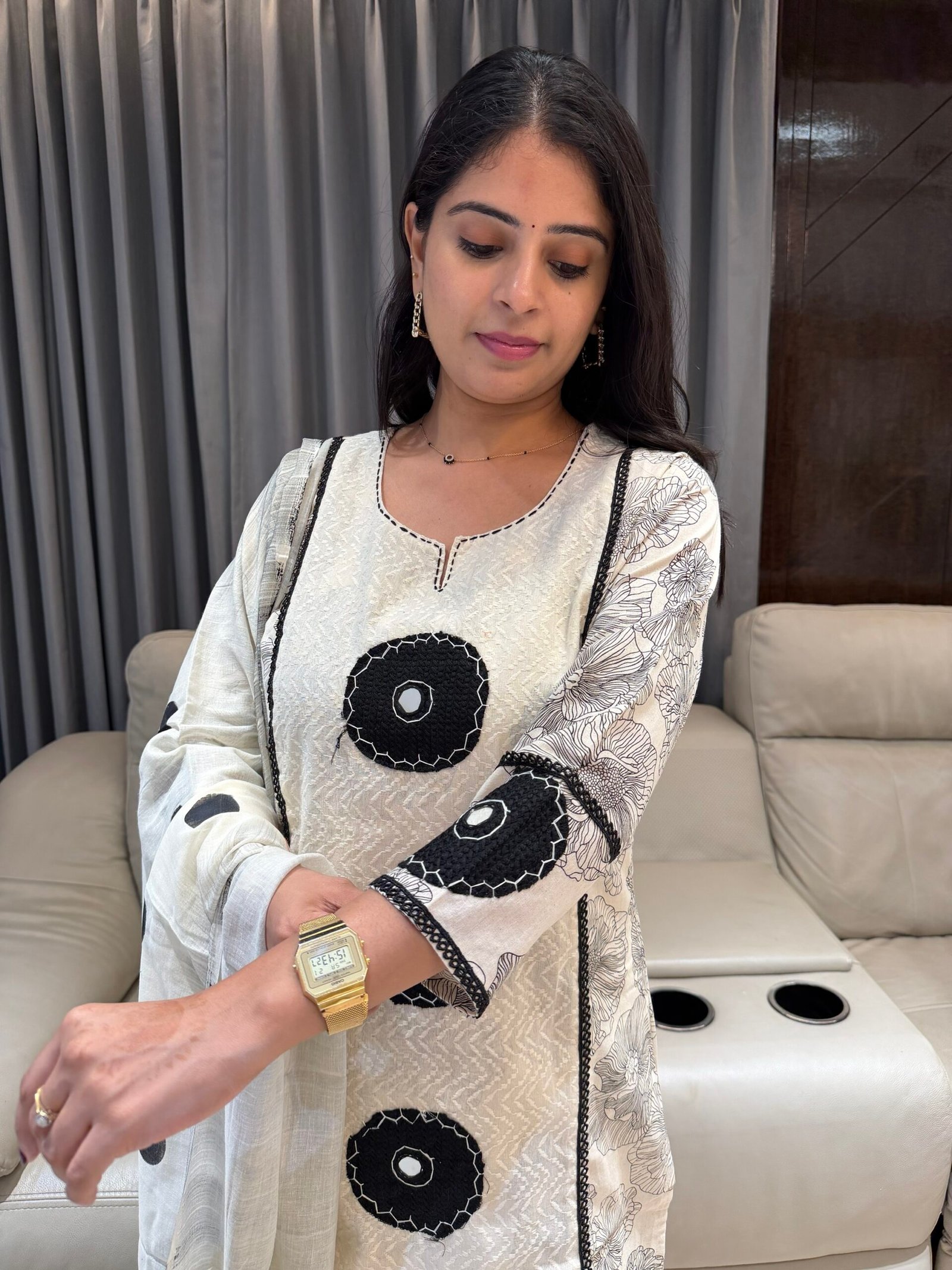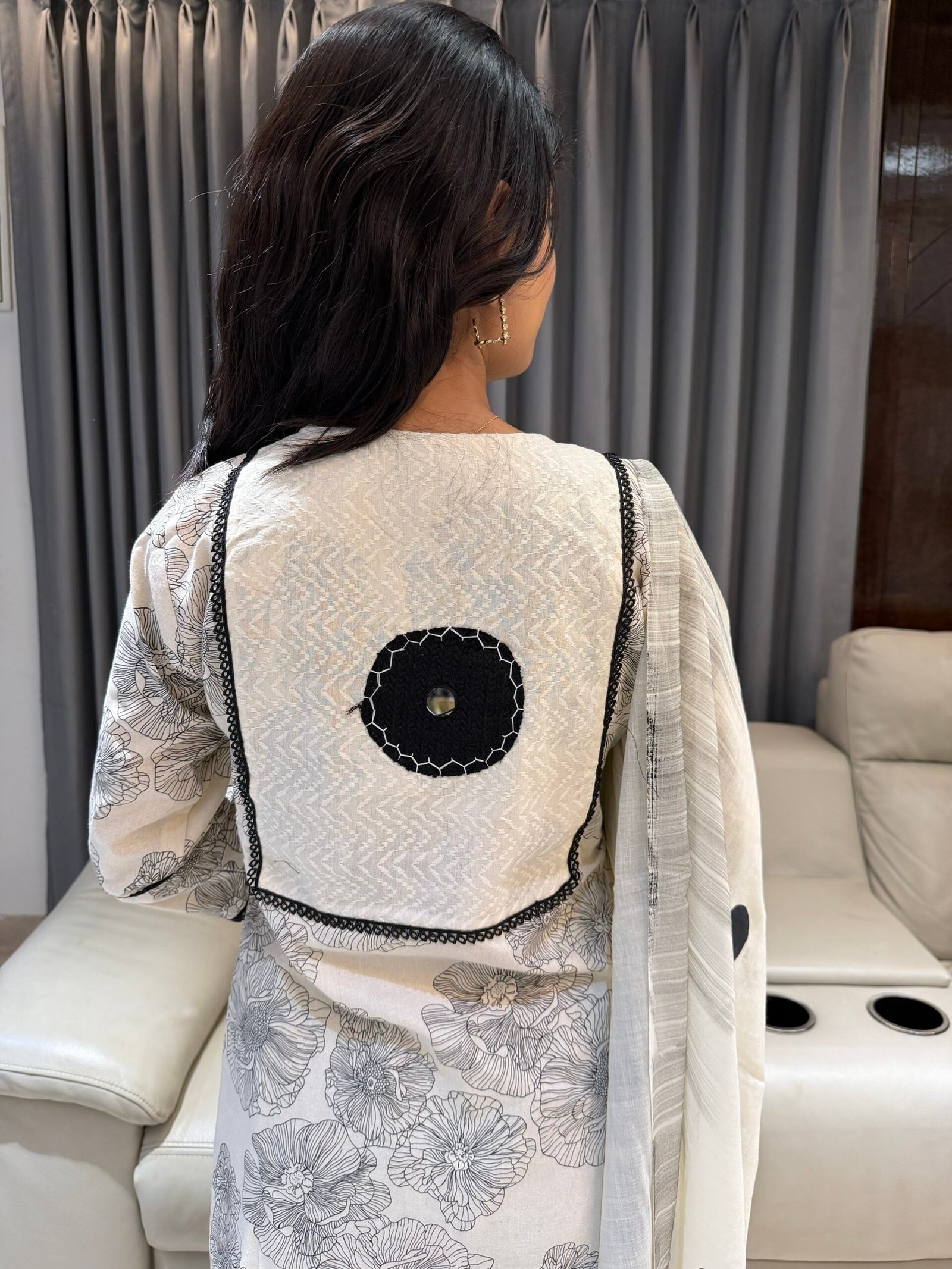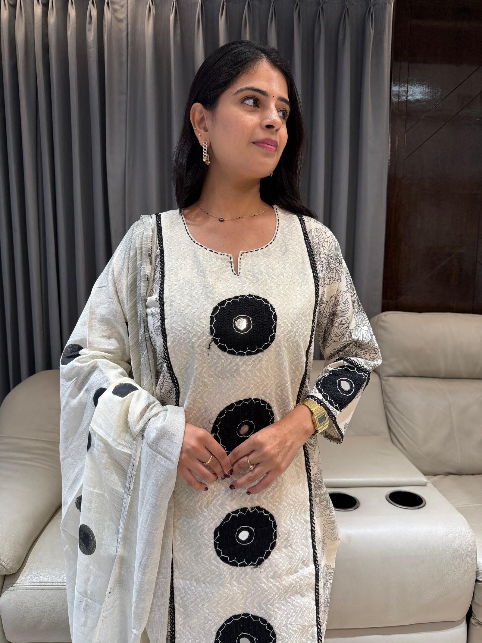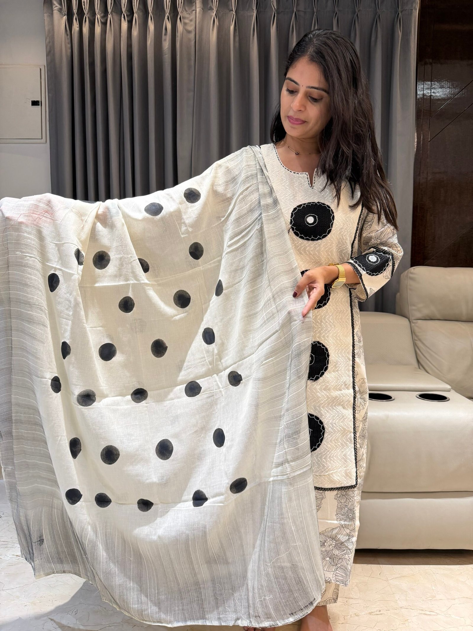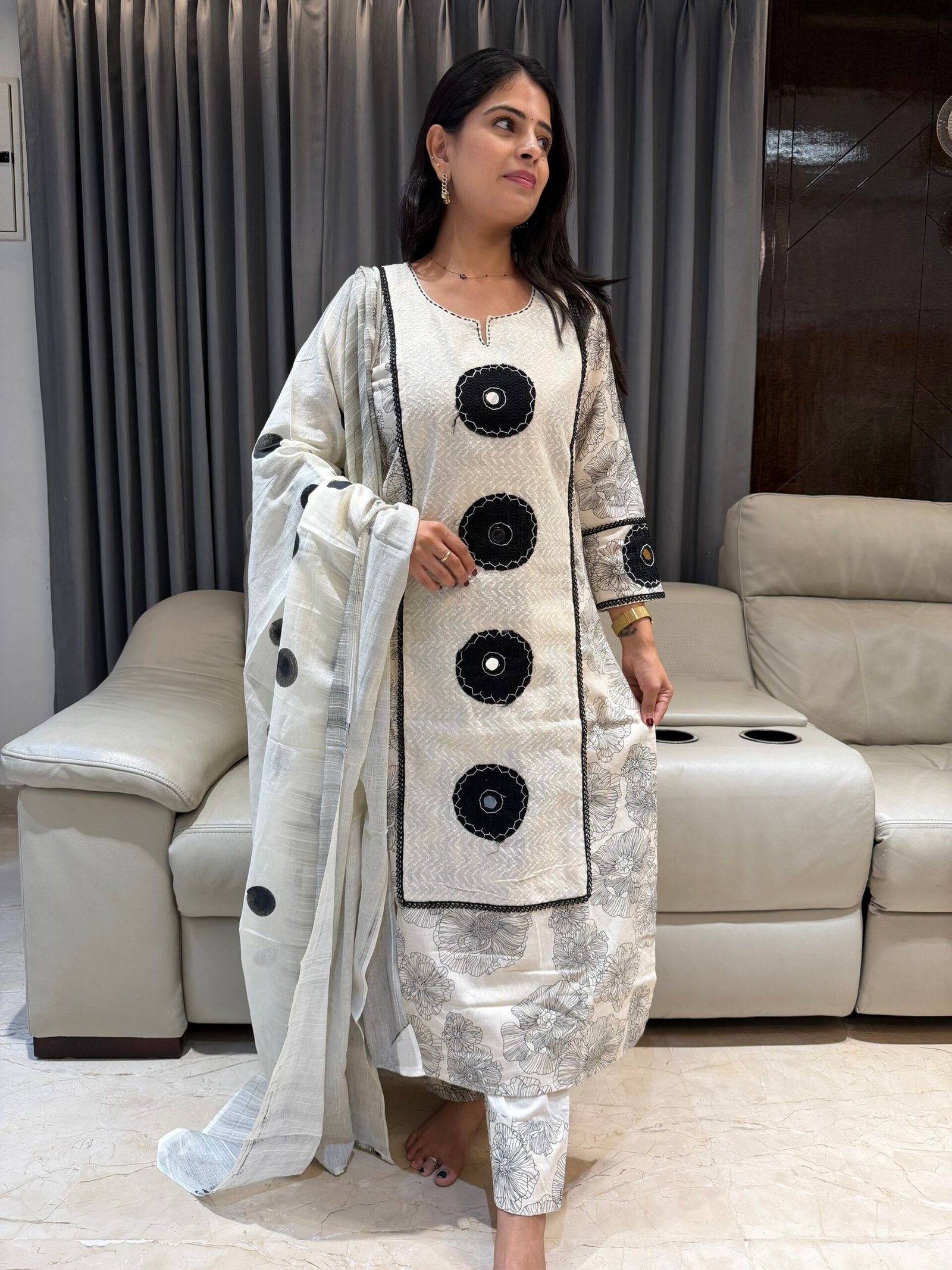 Elevate your ethnic wardrobe with this gorgeous off-white and black kurta set. Featuring a unique blend of floral block prints, bold appliqué circles, and a classic polka dot dupatta, this outfit is the perfect blend of tradition and trend.