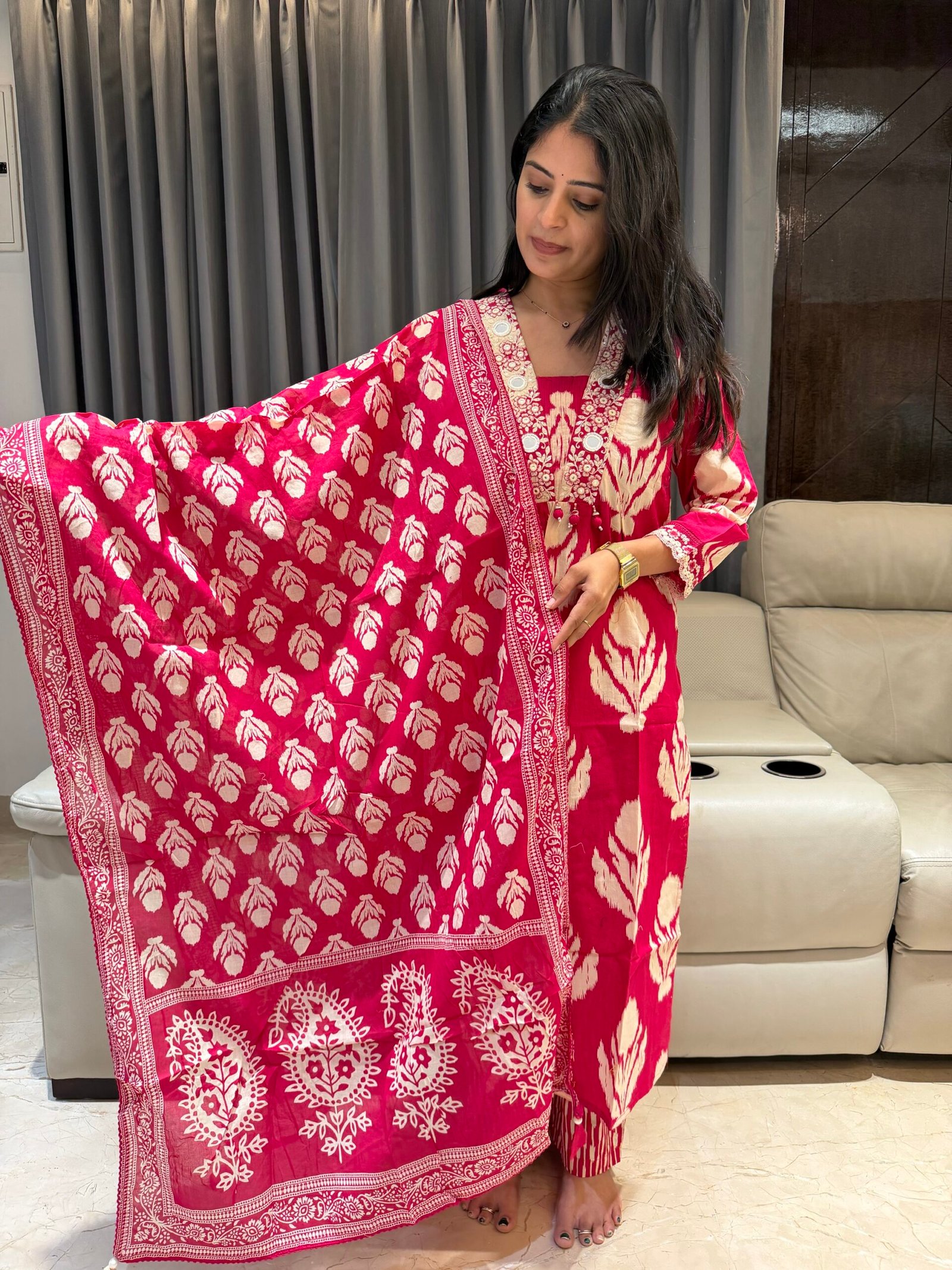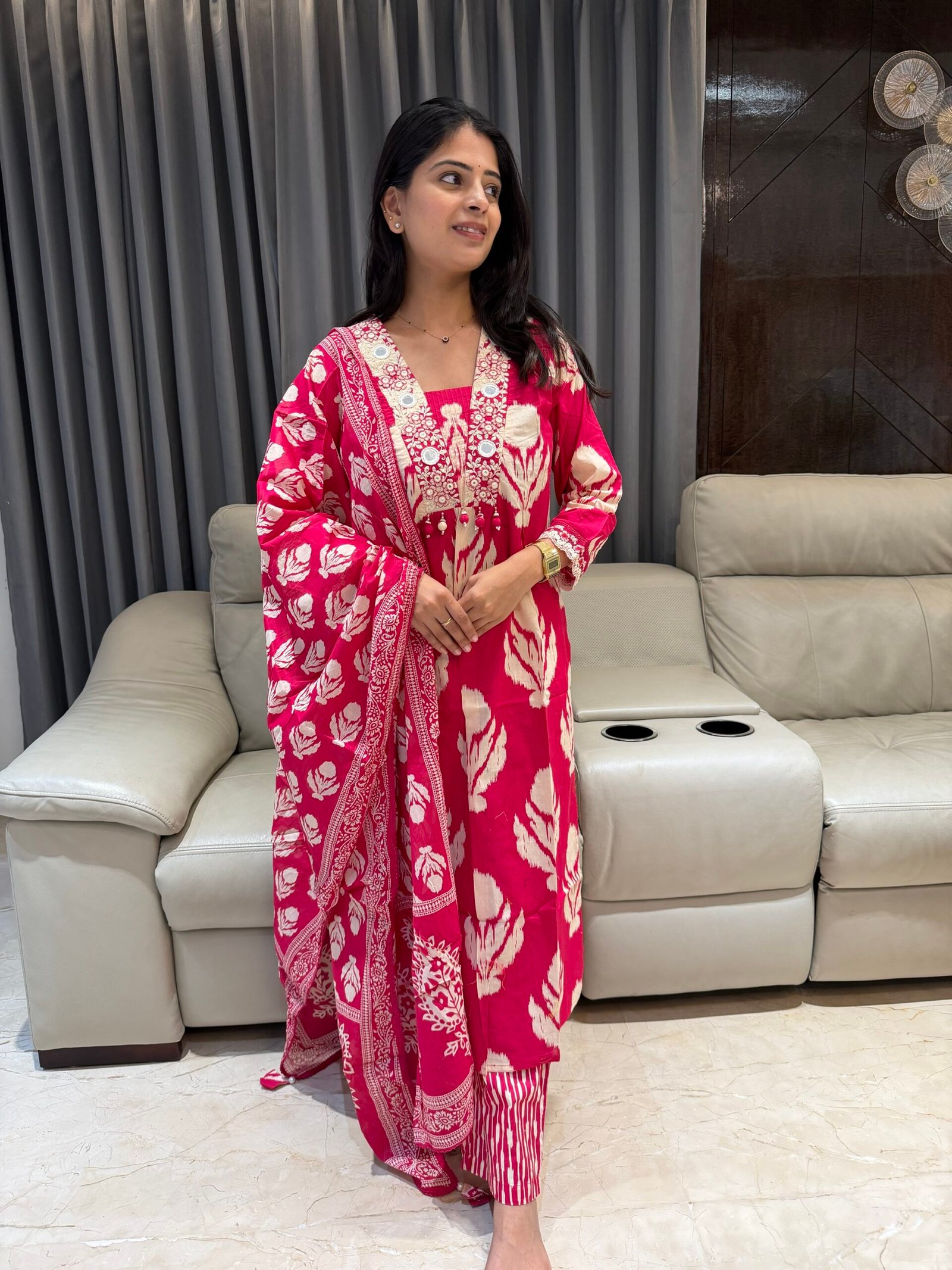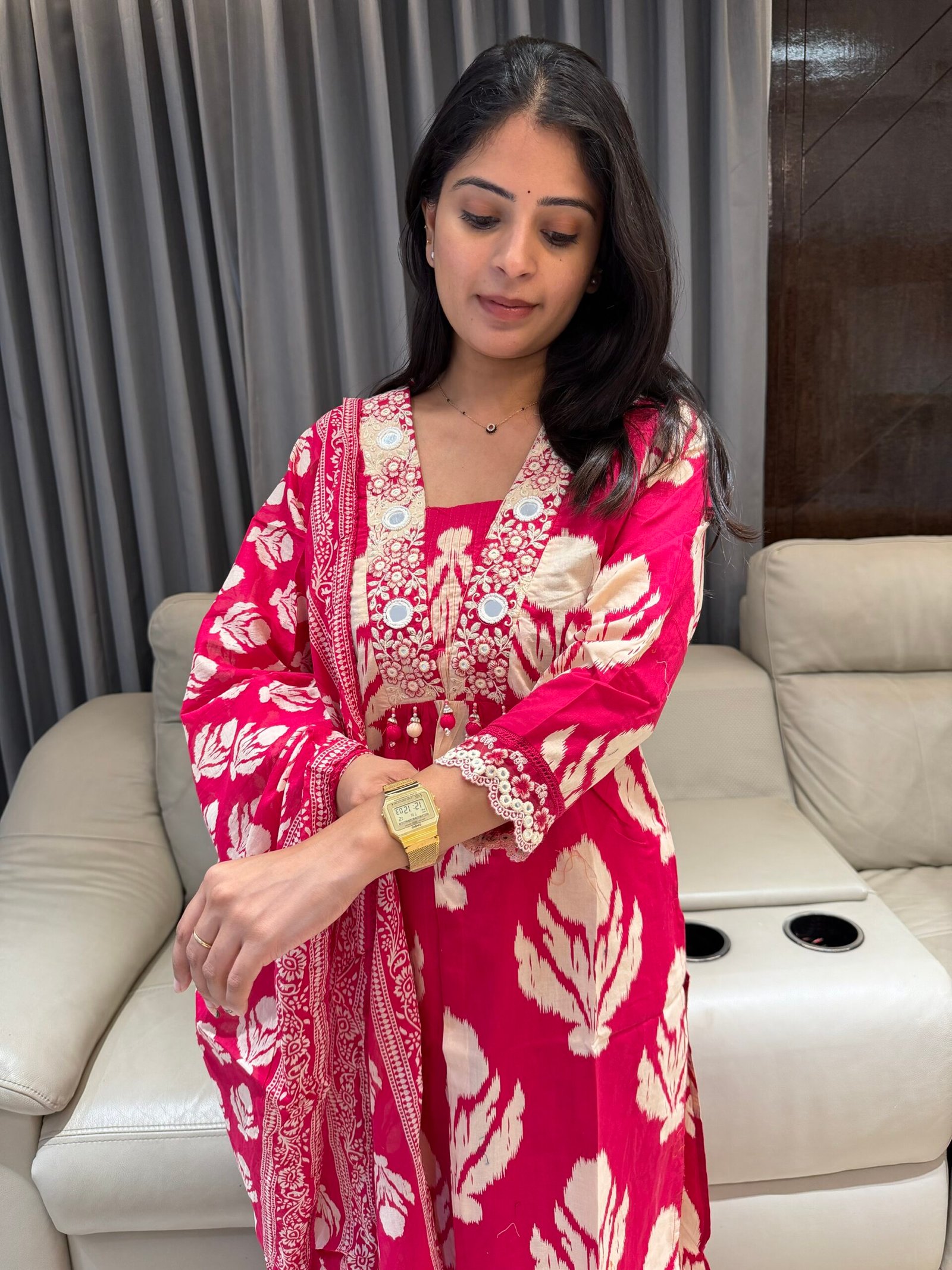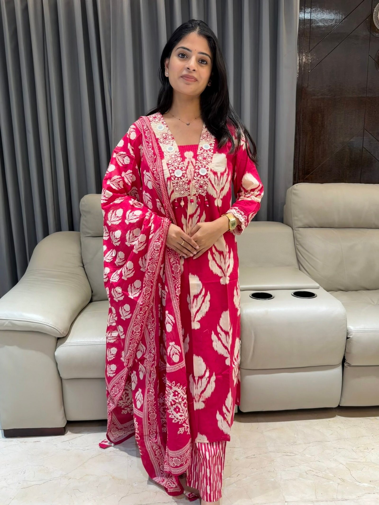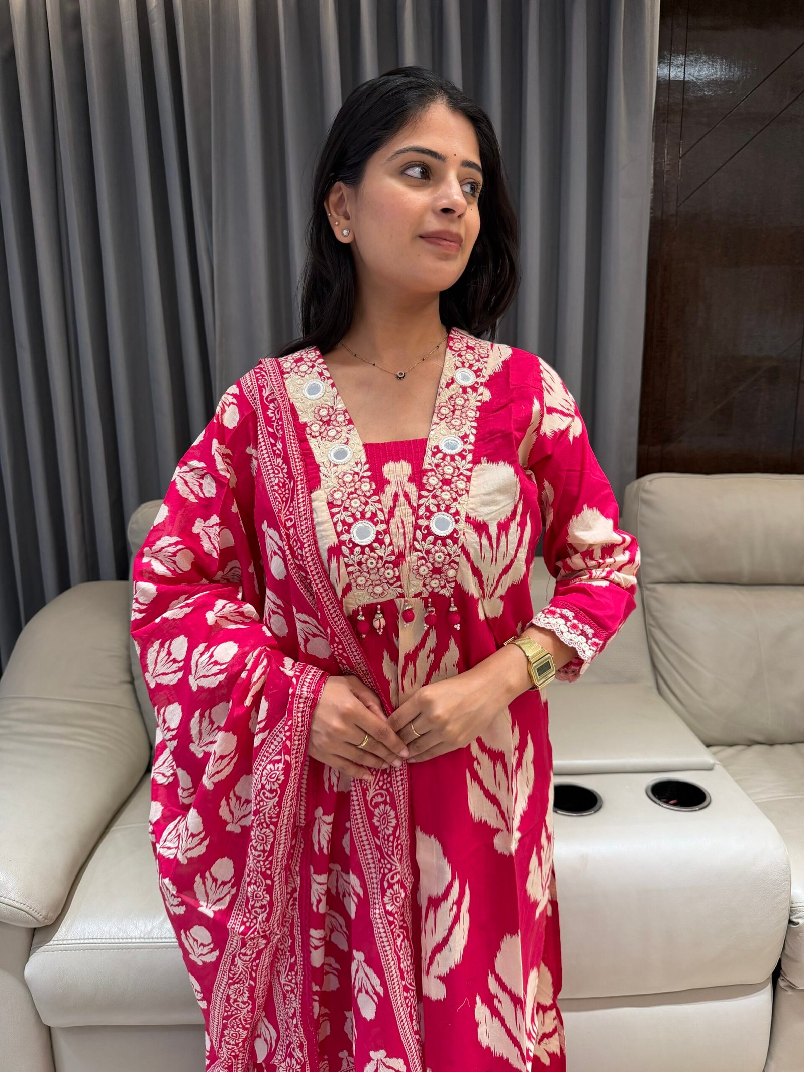 Step into comfort and style with this stunning cotton kurta set, featuring intricate floral prints and a beautifully detailed dupatta that adds a graceful charm to your look. Perfect for everyday wear, brunch dates, or festive vibes 🌸