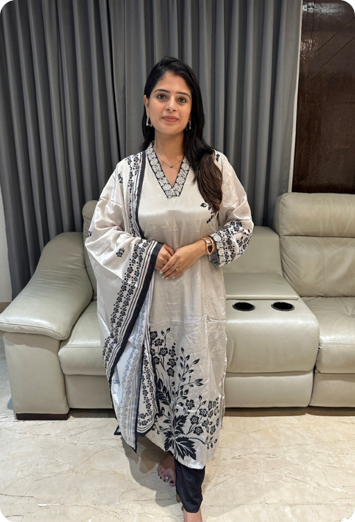 Be the first to review “Pure butter muslin V neck kurta set with black floral digital prints and embroidered neck” Cancel reply